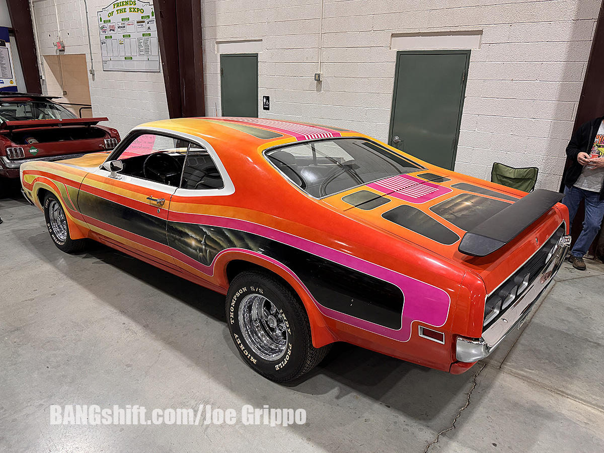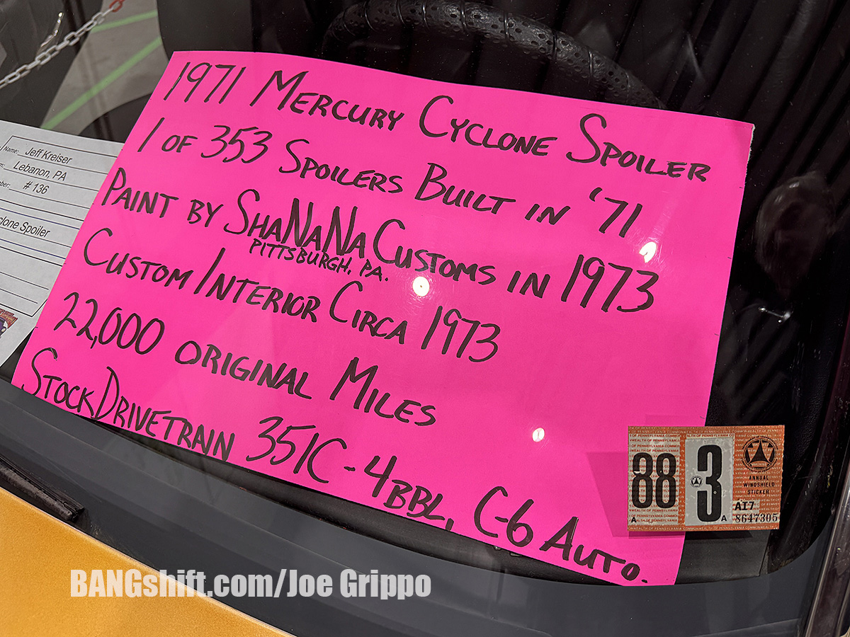 This year’s show had some amazing survivors and barn find type stuff. Check out the 1957 Ford with twin carbed Y-Block and Paxton Supercharger, the killer tunnel rammed big block chevy powered ’68 Camaro resplendent in B/MP trim, complete with a quarte window full of Atco Dragway kill stickers! Killer stuff. My favorite machine in show was the Survivor 1971 Mercury Cyclone Spoiler street machine; you can’t miss it in the gallery! A real deal time capsule from the early ‘70’s, this is one of only 353 Spoilers built in 1971, which is special enough, but the wild custom paint job and body work applied in ’73 is mind-blowing. The colors, design layout, and murals kept me coming back to it all day. And don’t sleep on the extra-stuffed diamond tufted custom interior with that crazy console!