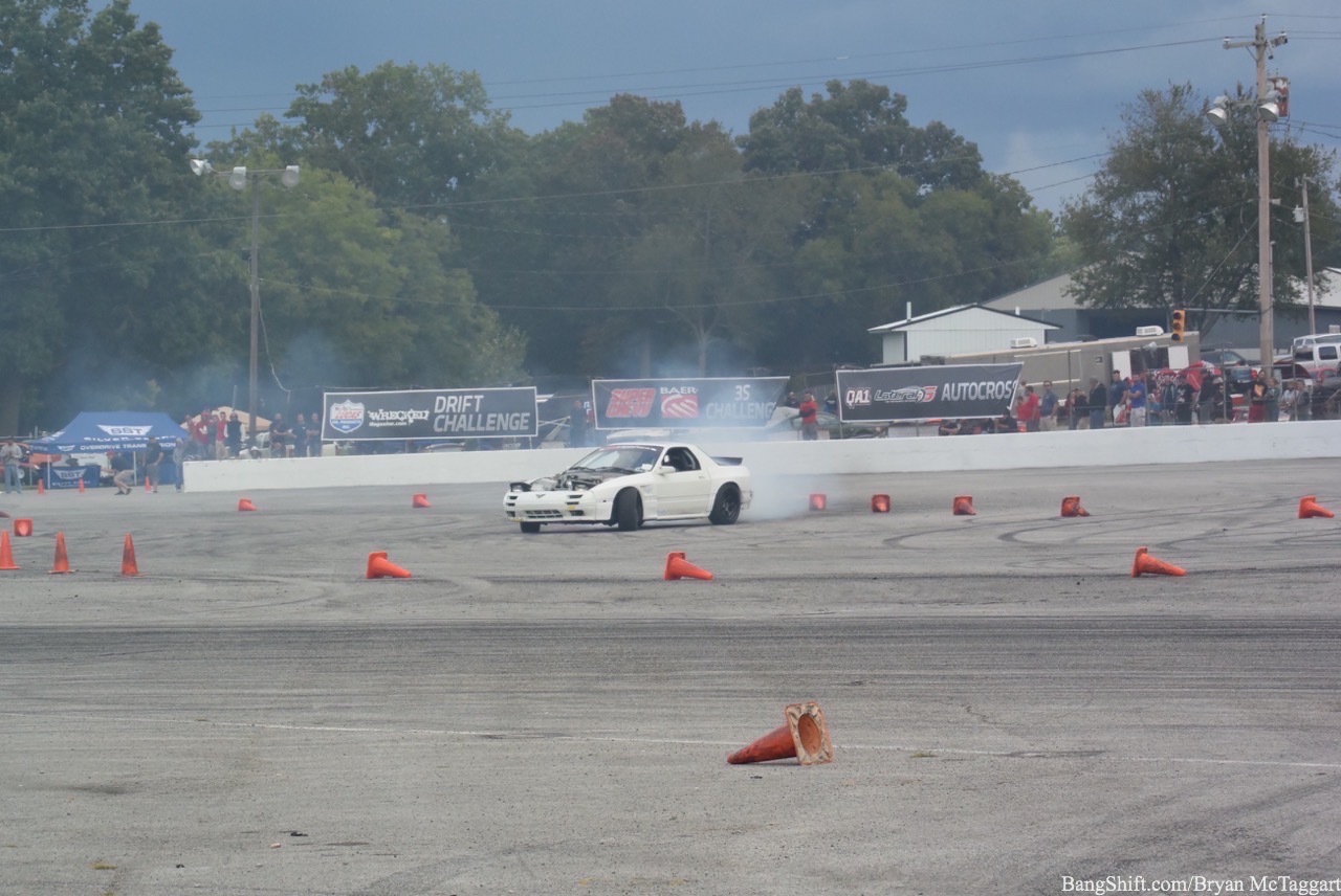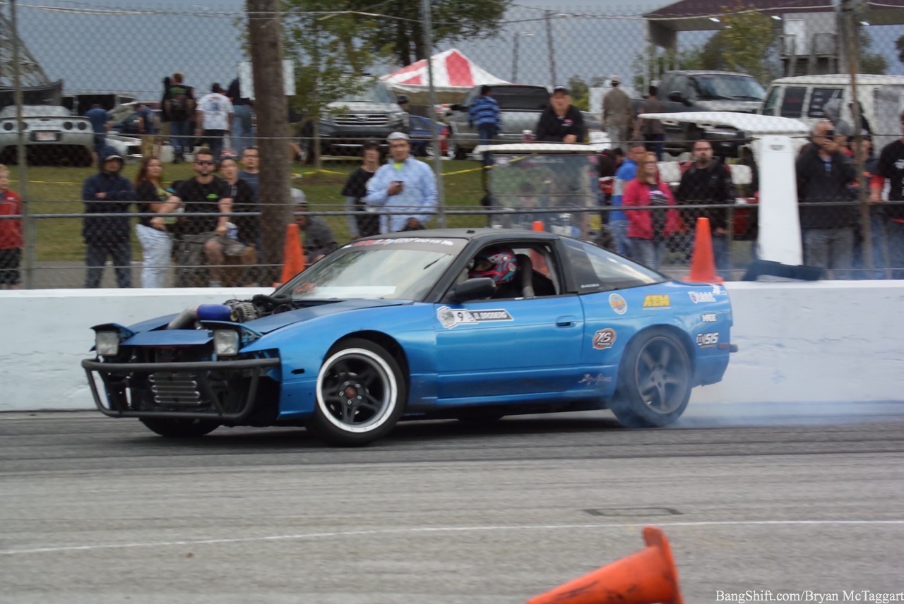 The engine is singing along at the upper end of it’s rev range while the brakes, steering and suspension get the workout of a lifetime and the tires serve their capital punishment. Don’t even ask about the car itself…drifters work beyond the limits of what is normal, so body contact isn’t an accident, but just part of the game. Swapped Nissan 240SXs from both the S13 and S14 generations were on-hand, and a few FC RX-7s were around, including the white car we saw power-slam the wall with it’s taillights last year. Additionally, a few BMWs were out and about and the domestics, a fourth-gen Camaro, a full-kill build GTO and a C6 Corvette that looked drastically out of place with the rest of the drivers were howling around, trailing smoke like a stunt plane as the impressive crowd cheered them on.