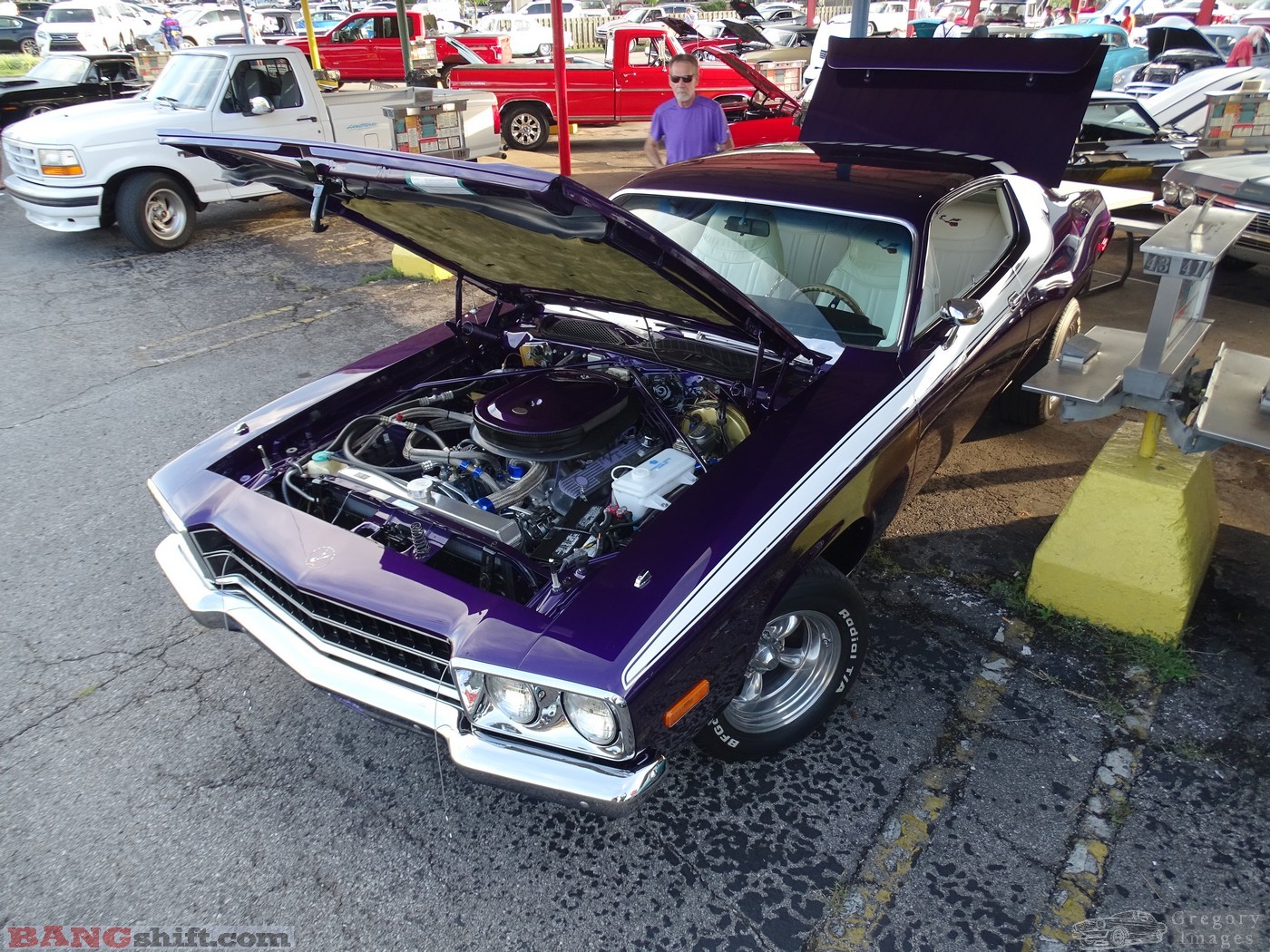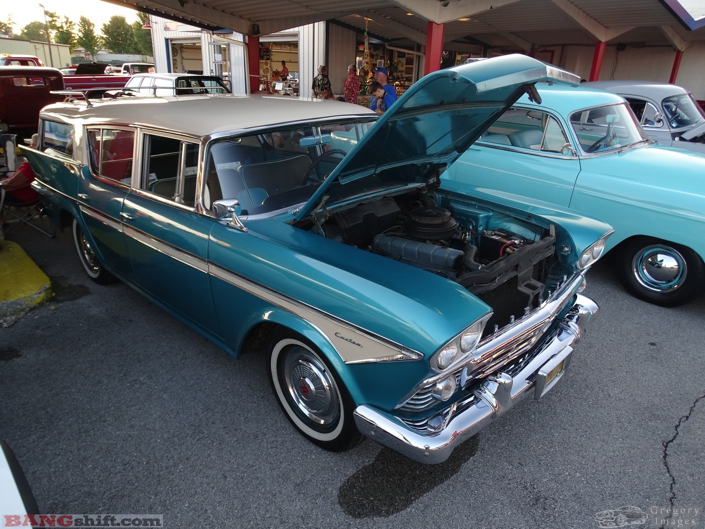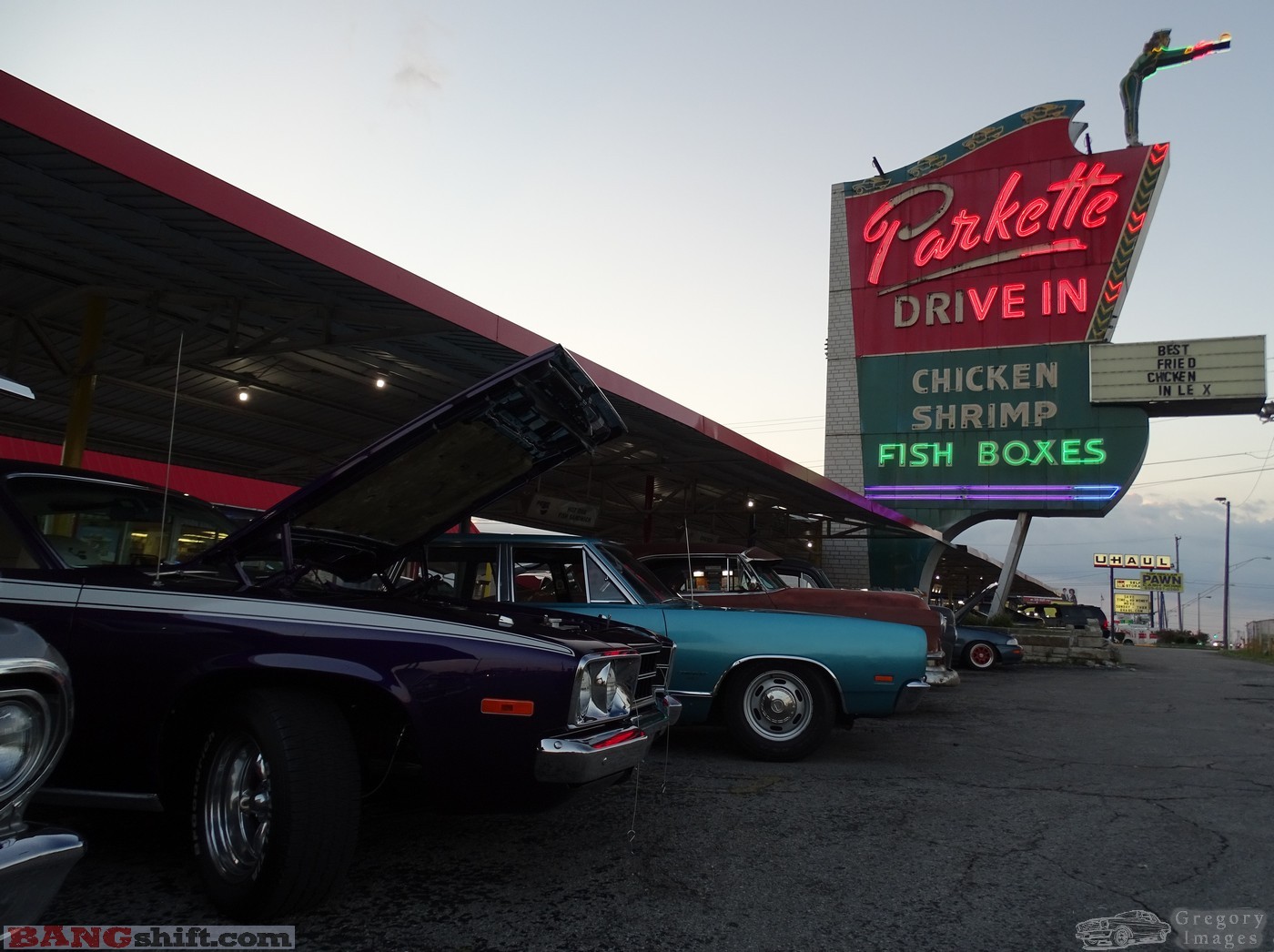 (Words and photos by Doug Gregory) – After having taken some more time off from visiting car events we find ourselves at the world famous Parkette Drive-in on New Circle Road in Lexington, KY. They have a monthly cruise organized by Richard Wilson that draws a good number of cars that come in and park and many that roll through. One of the best parts of having a cruise here is the food. This place has the atmosphere and décor to make it a very pleasant experience. Each cruise-in has a car-hop’s choice trophy that this year went to a very-deserving, purple Plymouth Road Runner.