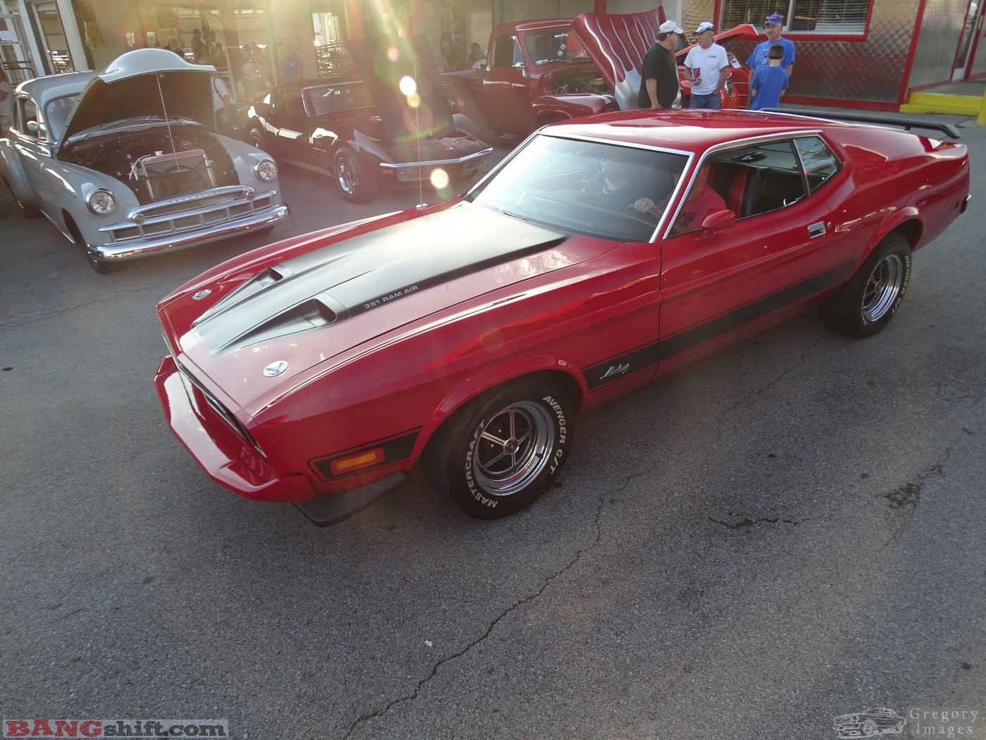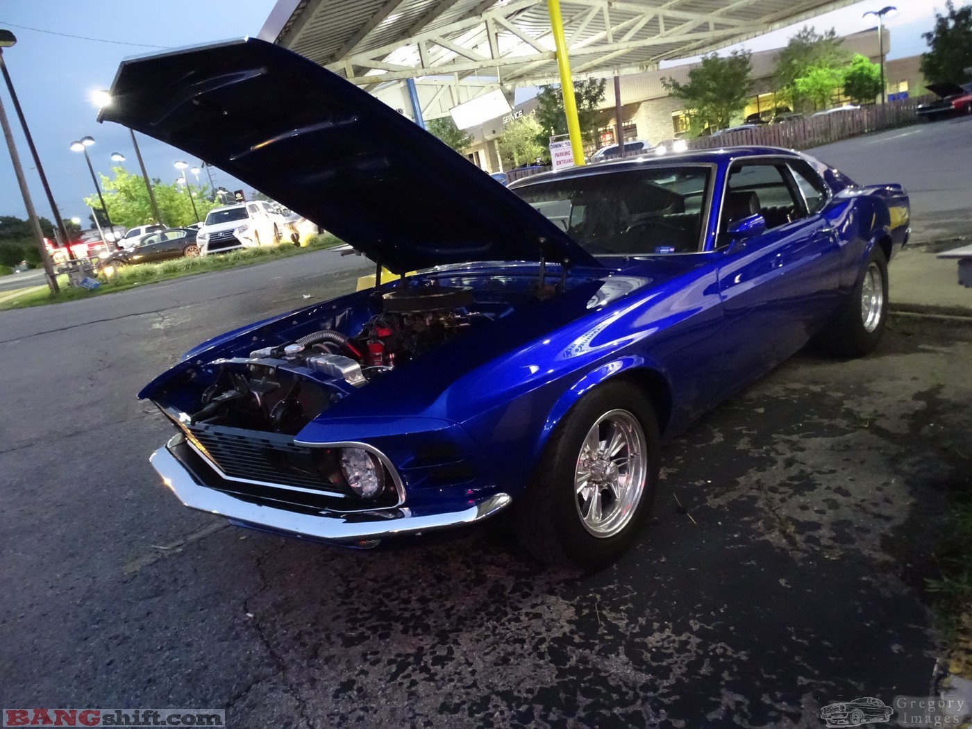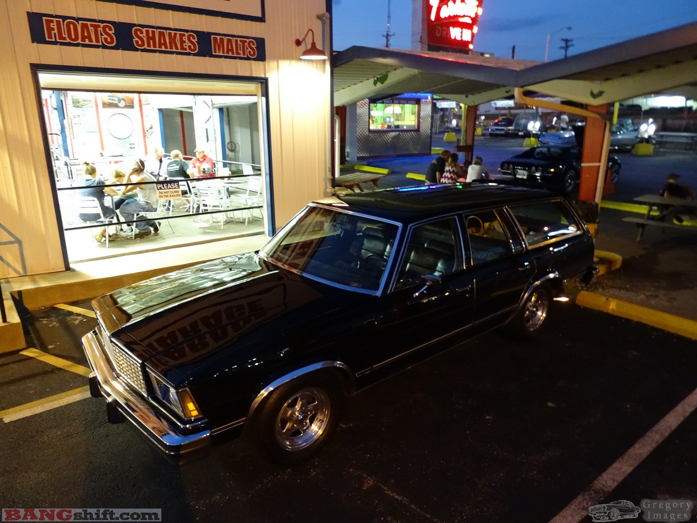 CWe’ve seen this ’64 El Camino before, but only briefly. I had mistakenly believed the wheels were reproductions. Not..real deal stuff and other old speed parts are on it as well. This deep blue ’70 Mustang sports roof sounded healthy and had several small touches we enjoyed. The night ended way too soon for us, but we did finally sit down to eat as my blood sugar dropped to knee-buckling levels. Not smart. You’ll note the sign is not as well-lit as the last time we brought you photos from here. It is a labor of love to keep this sign going. The ownership is not allowed to change the sign (city ordinance I believe) over to LEDs or some other configuration that is more reliable. They have spent a lot of money trying to keep everything working. I hope they are able to keep it, but the city’s unwillingness to let them update the lighting might end up costing more than it’s worth. Hope not.