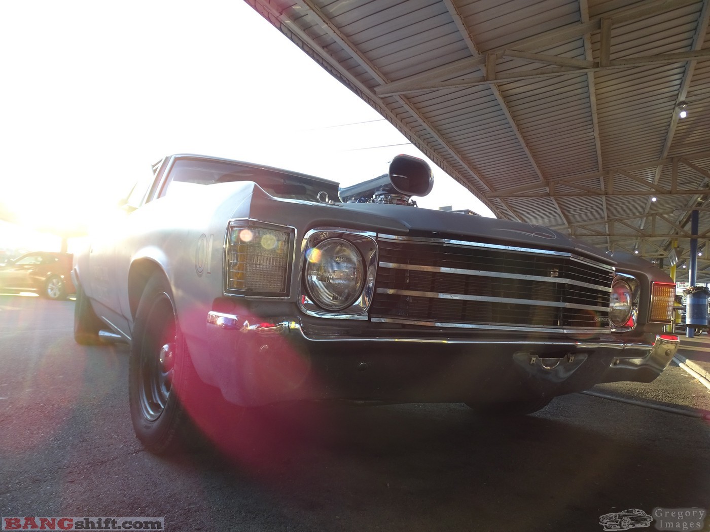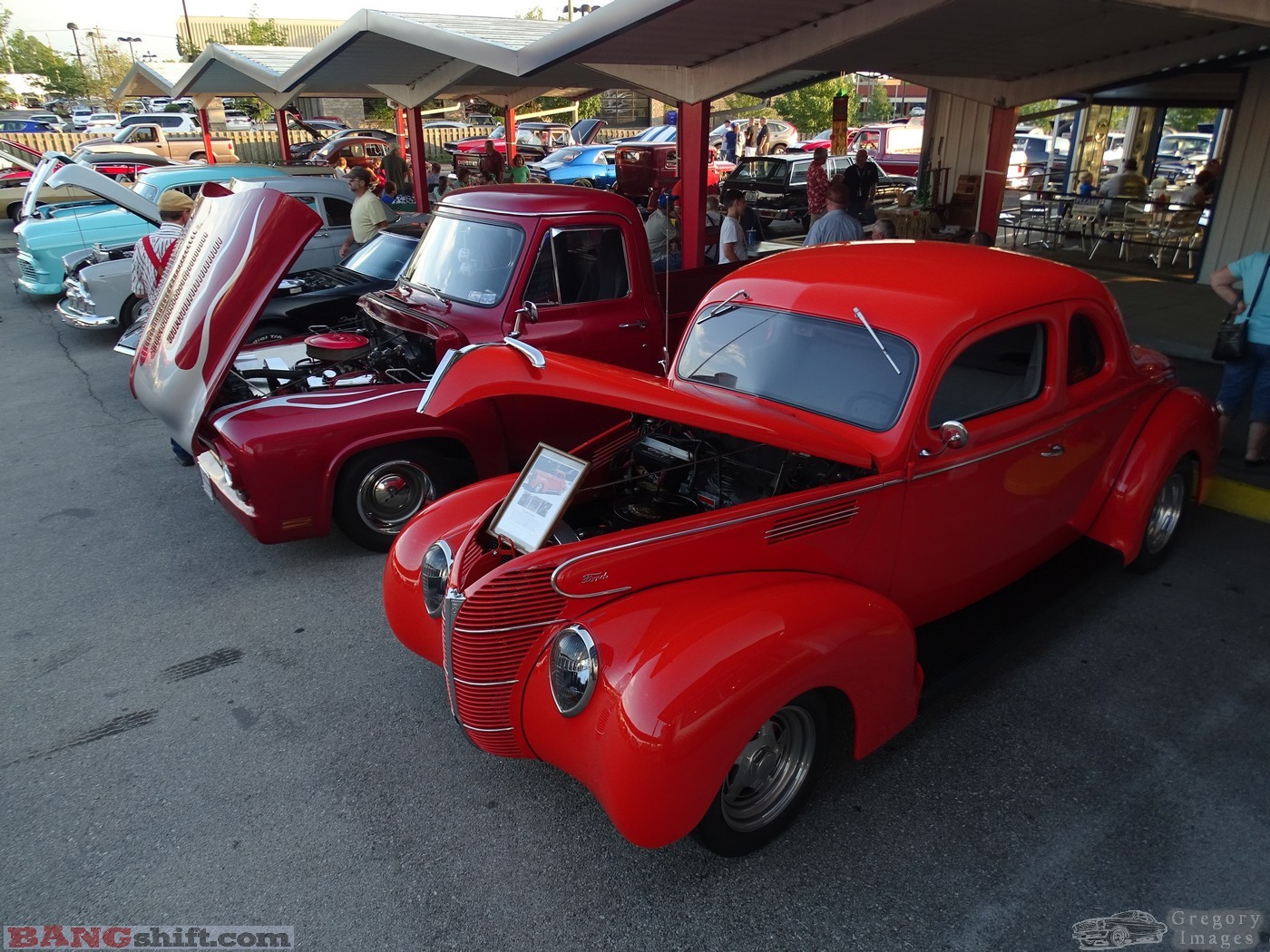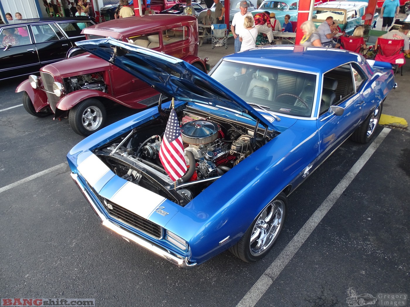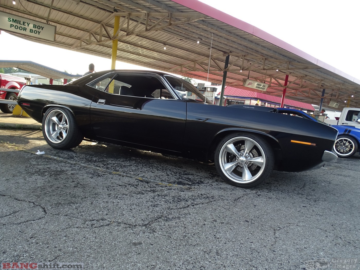 CWe’ve seen this ’64 El Camino before, but only briefly. I had mistakenly believed the wheels were reproductions. Not..real deal stuff and other old speed parts are on it as well. This deep blue ’70 Mustang sports roof sounded healthy and had several small touches we enjoyed. The night ended way too soon for us, but we did finally sit down to eat as my blood sugar dropped to knee-buckling levels. Not smart. You’ll note the sign is not as well-lit as the last time we brought you photos from here. It is a labor of love to keep this sign going. The ownership is not allowed to change the sign (city ordinance I believe) over to LEDs or some other configuration that is more reliable. They have spent a lot of money trying to keep everything working. I hope they are able to keep it, but the city’s unwillingness to let them update the lighting might end up costing more than it’s worth. Hope not.