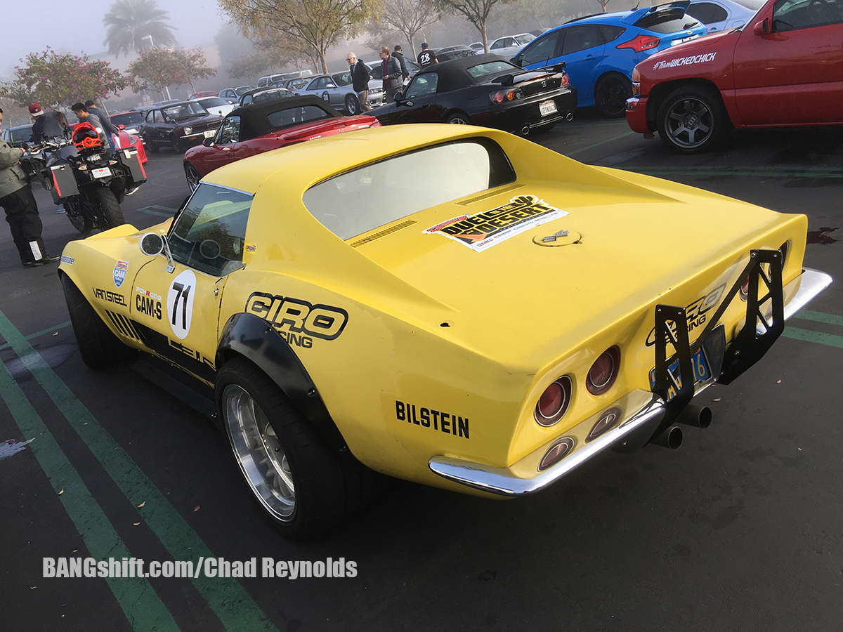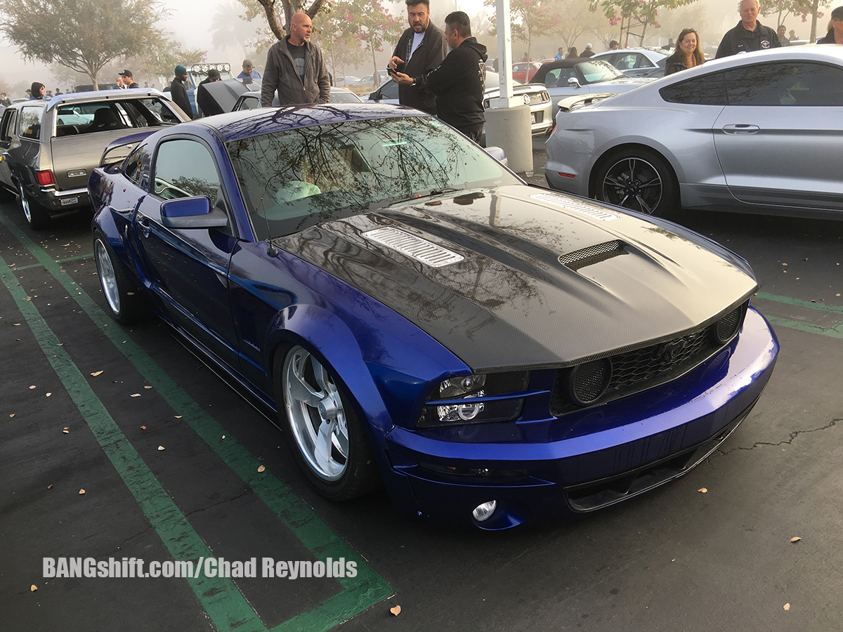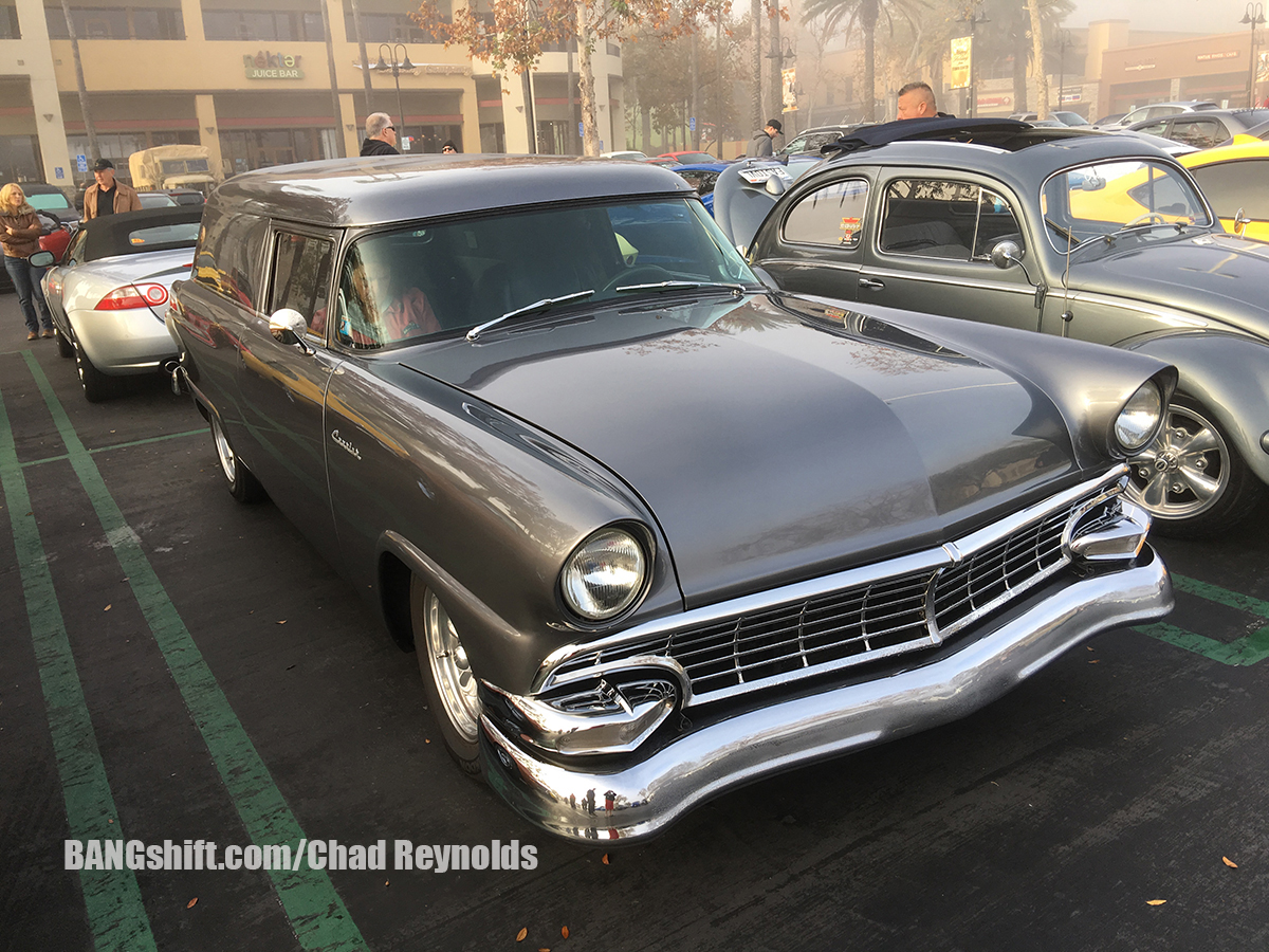 So after getting the address for the meet, and being told that the route would be handed out on site at around 8 am with an 8:30 am departure, we decided we would need to leave the house around 6:30 am. We hit the road, drove to the hour or so to Aliso Viejo, and had a gourmet breakfast of Del Taco before heading over to check out all the cars on hand. It was incredibly foggy on our way to the meet, and a little chilly. It was typical SoCal hoodie weather and was very damp and overcast. There were hundreds of cars in the parking lot, and they ranged from new to old, domestic to import, and everything in between. There were Lambos, McLarens, Corvettes, Mustangs, Camaros, Imports of all kinds new and old, and some familiar Pro Touring machines from the area including Matt Alcala in his cool Mustang, Steven Rupp in his Chevelle Wagon, and several others. While I shot photos of all the parked cars, Cole and I figured out a game plan for him to shoot all the on-road action while I drove his truck. We left near the front of the pack, drove slow, used the center dividers and shoulders to our advantage, and Cole got his hang out the window on to grab some cool shots.