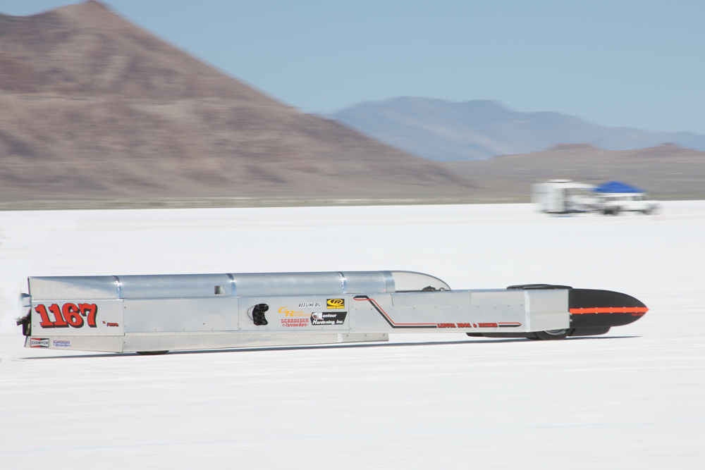So you think you are good at hot rodding? You may be, but you are nowhere as good as Mark Lingua. Mark is the guy who dreamed up, built, and drives the streamliner below. The machine is classified as a K/BFS (K-motor blown fuel streamliner). The K-classification in SCTA means that the engine displaces 30ci or less. That’s right, 30ci or freaking less. Despite having half a liter of umph making power to proceed with, Lingua has driven this car up and over 220 mph. How is that possible? Mainly because Lingua is a bad ass.