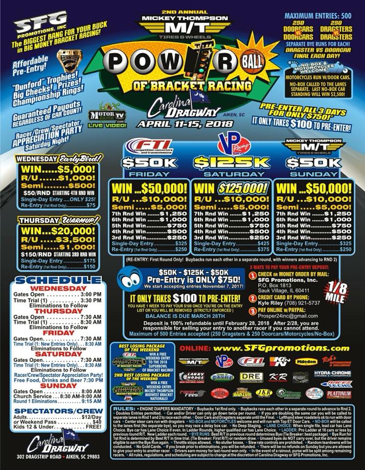 Racing starts up again at 9AM Eastern at the Powerball of Bracket Racing event Carolina Dragway in Aiken South Carolina Sunday. If you are a fan of big money bracket racing, this is a great warmup for our live coverage of the Spring Fling Million starting next week right here at BANGshift.com. Until then, enjoy end to end coverage from our friends at Motormania TV right here and now as bracket racers from all over go for the $125,000 grand prize Saturday and $50,000 on Sunday! This is a big money race where someone is going to potentially win life changing money. Who knows, if someone does real well they might pack it up on Monday and drive straight to Las Vegas!