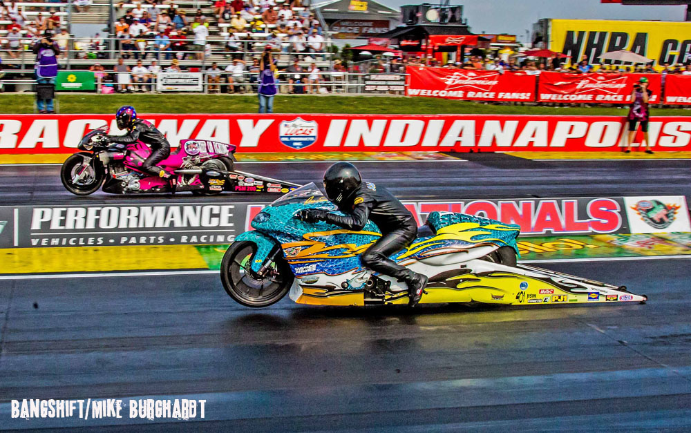 In Pro Stock Motorcycle, Jerry Savoie took home his second victory of the season with a 7.011 at 193.02 on his Savoie’s Alligator Farm Suzuki (near lane), beating No. 1 qualifier Chip Ellis who fouled out at the start on his PiranaZ/Pippin Motorsports Buell. The win was Savoie’s third career victory and his first at Indianapolis. He was the runner-up here in 2011 and 2014. He defeated Chaz Kennedy, Steve Johnson and Hector Arana Jr. to advance to the final.