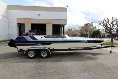 I have had the boat at 120 mph by GPS, with two people in the boat, and there was a lot more throttle left. With the boat’s current configuration, I expect that under the correct conditions and with an experienced driver and safety equipment, top speed would be 140+ mph. Adjusting the trim tabs, changing the prop, and modifying the turbos and wastegates would probably add a lot of top end. I am not recommending anyone take any boat to these speeds without experience and restraint.