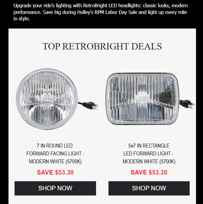 I’m a huge fan of Holley’s RetroBright LED headlights. They look stock, which is how you want the headlights in your muscle car, street machine, hot rod, or classic truck. They look great, and work even better! These are incredibly effective on the road in the real world, and they are available in different color temps for the look you want for your ride, and also in yellow. Check them out and save big with the Holley RetroBright sale going on right now.