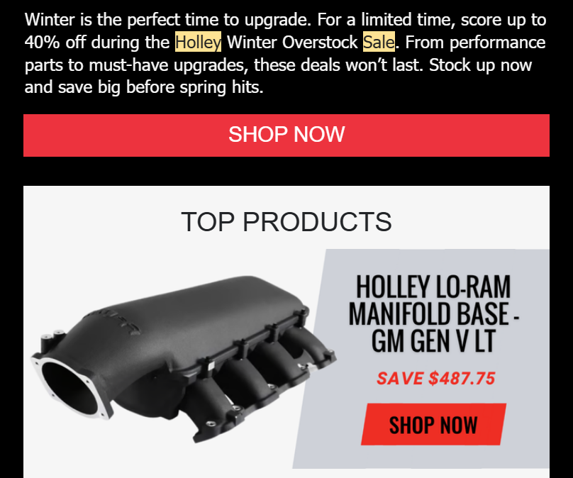 Man are there some deals right here! Holley has tons of parts on sale now to make room for new inventory! If you have been waiting for a deal on the right parts, then this just might be the time. Click on any of the photos below to go to the sale page where everything on sale is listed for up to 40% off!