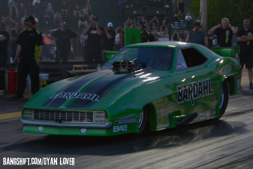 One of the highlights of the first night came from Spokane, Washington’s Chris Davis, the first nitro car down the track. Davis lifted the front wheels three feet off the ground when he hit the throttle and carried the front end nearly to half-track before setting down and being forced to shut off.