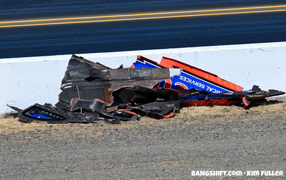 Daniel Wilkerson’s SCAG Power Equipment Mustang erupted in a massive fireball following a catastrophic internal engine failure during eliminations. The body was completely destroyed as the car grazed the wall, but Wilkerson was able to climb out under his own power, thankfully uninjured.