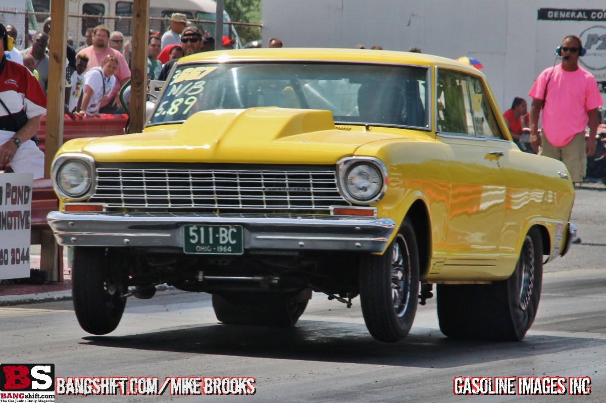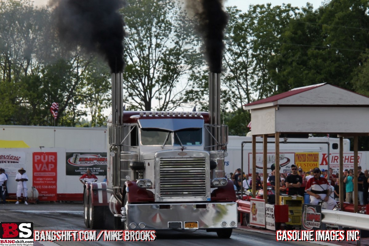 (Words and photos by Mike Brooks) – Sunday July 3rd made an incredible day of drag racing at Empire Dragway in Leicester, NY. The track hosted their “Stars and Cars” event and it was a big one! I hit the road early along with Bangshift contributors Jose Ferrer and Brian Ackley and we were blown away upon arrival to the historic 1/4 facility. This place was jam packed!! The house was filled with over 9000 spectators and racers! By far, the biggest field and crowd we’ve ever seen here. It was awesome! The event featured a full card of bracket racing, Ashpalt war shootout, Can/Am super stock series, along with match racing from the likes of Dave “Daddy Dave” Comstock, Chris “Kamikaze” Day, Chris Hamilton a.k.a. “Boosted GT”, and the legendary Nova and S-10 of Larry Larson.