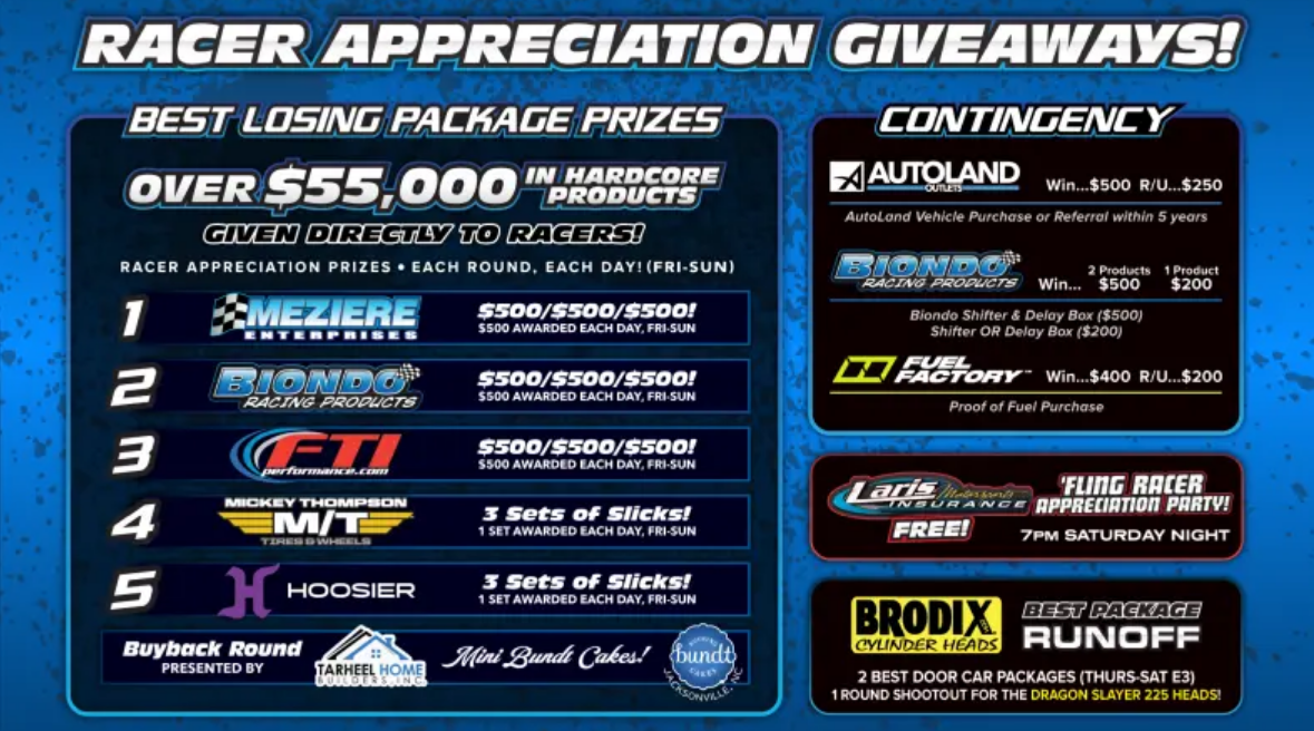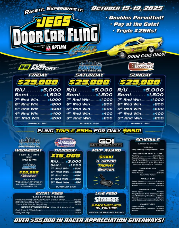 Door car drag racers rejoice, it is time for the DoorCar Fling! Yes, the Fling series has started a door car only event and the racing starts today! With $15,000 on the line both Wednesday and Thursday, and then $25,000 each day for Friday, Saturday, and Sunday, it promises to be an awesome drag race at Galot. Below the livestream player are all the flyers and details for the event. Check it all out below!