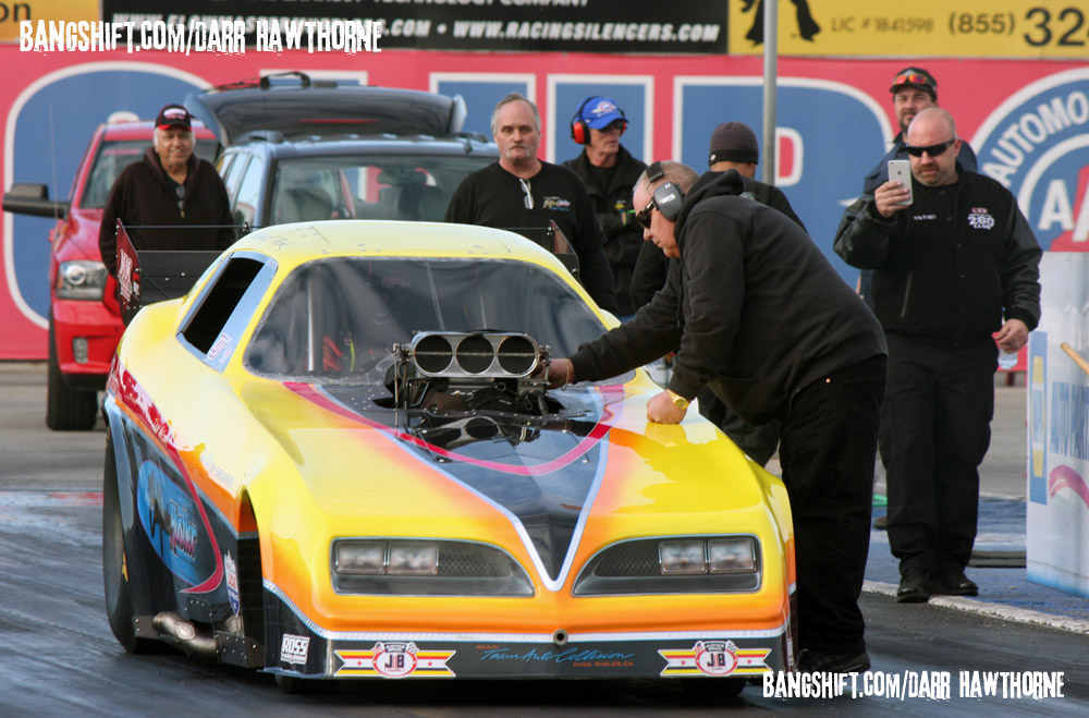 Cottrell made a Thursday afternoon test run for this weekend’s 49th Annual Firebird Raceway Ignitor. He ran a soft 6.01/218.15 dropping cylinders against Michael Peck (above) driving Don Nelson’s “California Hustler” Firebird, who ran 5.90/232.31.