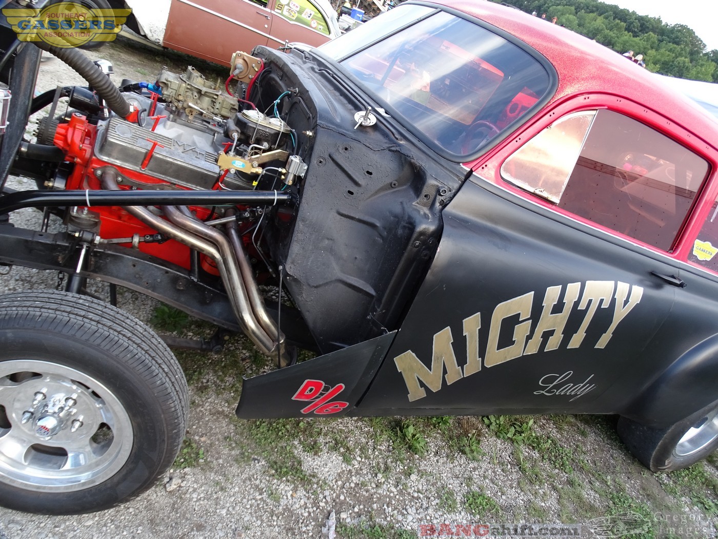 Jack McDaniel’s black and dark red Chevy coupe, Mighty Lady, is small-block powered.  I did a poor job of gathering information at the track and dragging information out of folks afterward has been spotty at best.