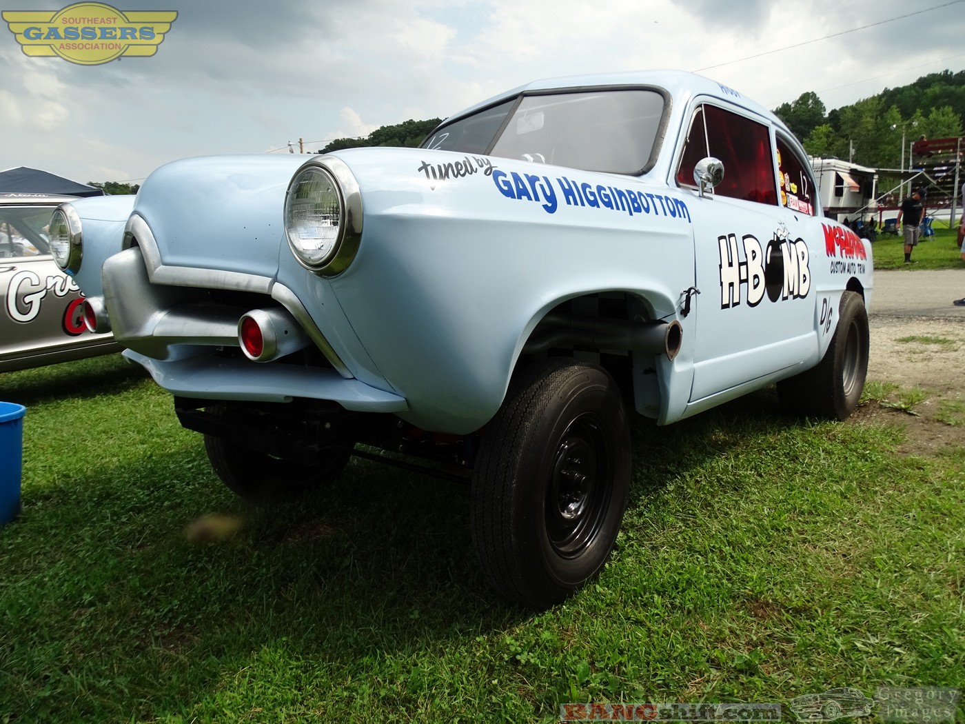 I know virtually nothing about the red Mr. Gasket Anglia panel other than it was wheeled by Kelvin Cannon and does amazing wheelies and dry hops.  This thing is quick and violent on the shifts, but goes straight down through broadway.  This thing sits over at the camp with the Sonee Hall cars so we know it’s stout.