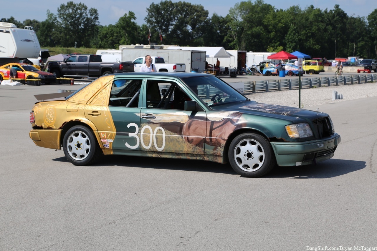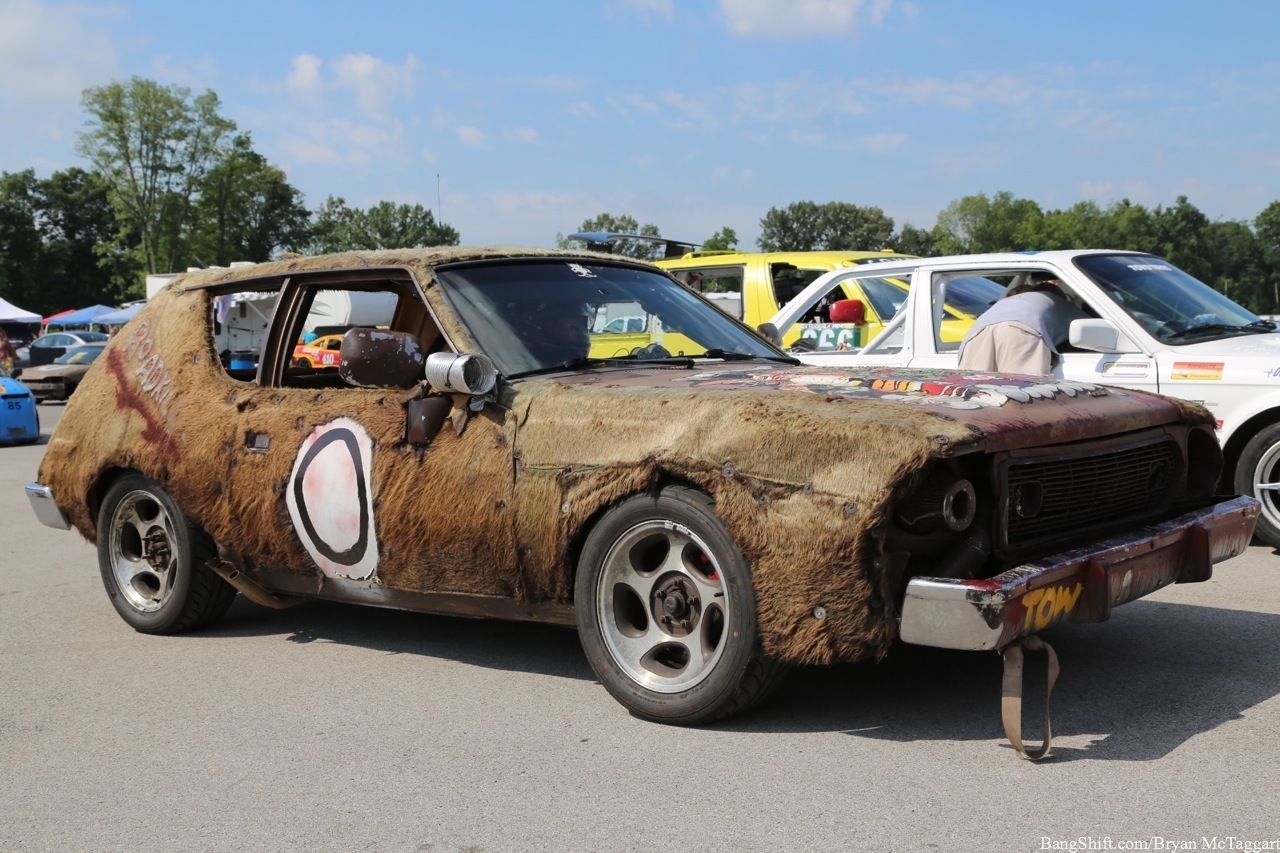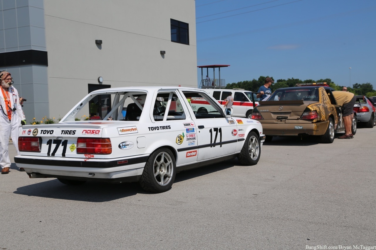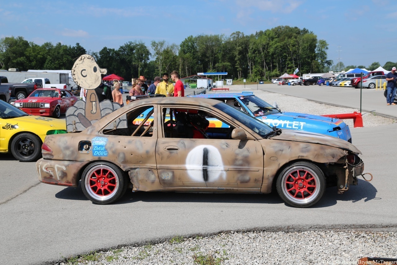 Cheap car racing is the best idea of the last twenty years. I’ve got nothing against demolition derbies as a way of thinning out the herd of beaters, but there is a distinct lack of massive barges out there that I’d be willing to use to bash into someone else with, and I’m not trusting a 1984 Cavalier to hold up, I don’t care who built the cage. Events like ChumpCar and the 24 Hours of LeMons, on the other hand, give old Trusty But Rusty one final shot at glory, a chance to be the race car they always had hoped to be…even though they had all the horsepower of a lawn tractor and could get stomped by a borrowed minivan in a stoplight drag. Since LeMons judge Eric Rood was in town to judge the “Kentucky (Demo) Derby” event at NCM Motorsports Park, I figured it was worth the effort to make a quick appearance in the heat and humidity to check out the sights and sounds.