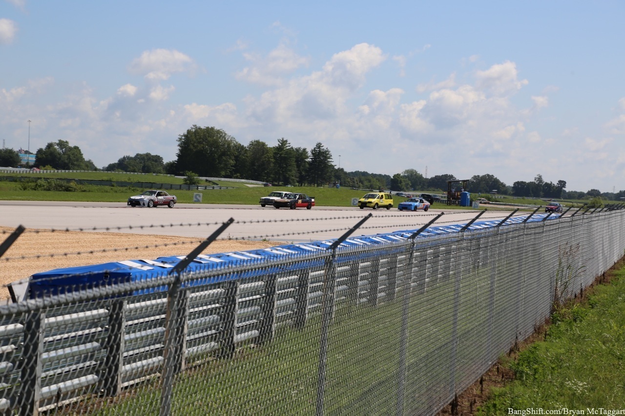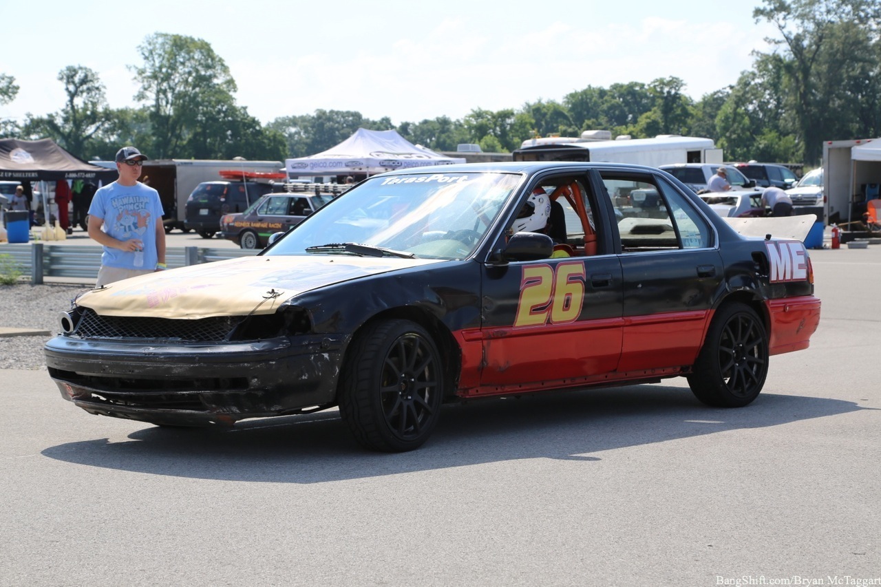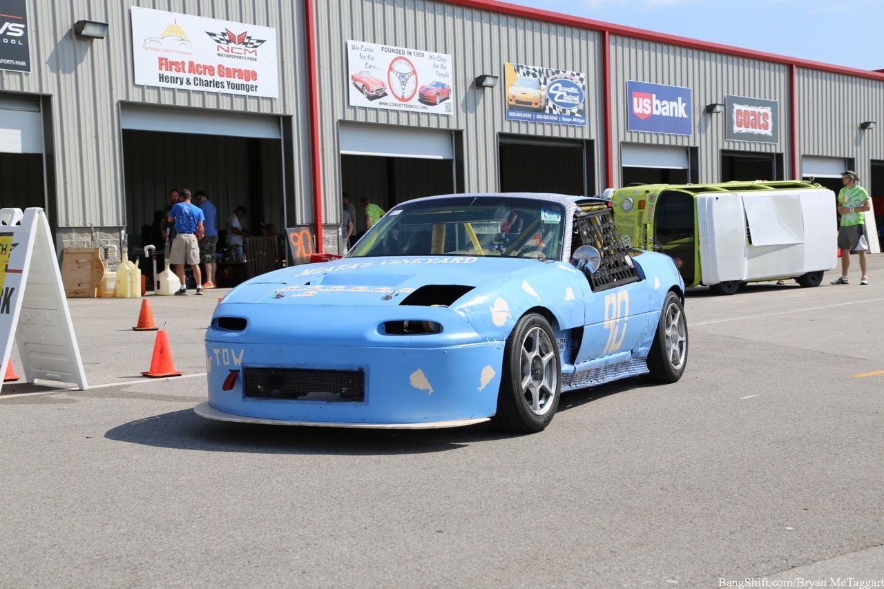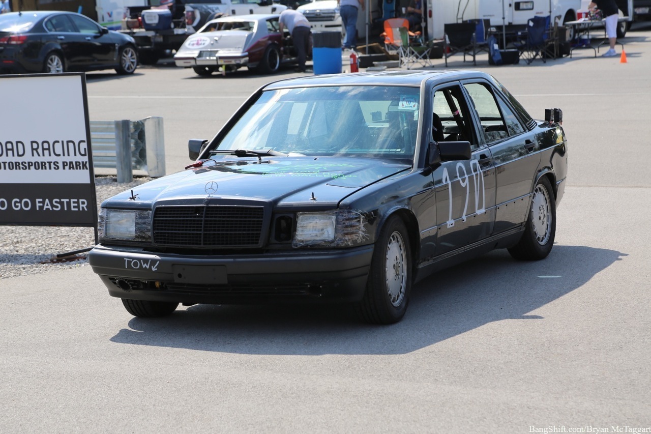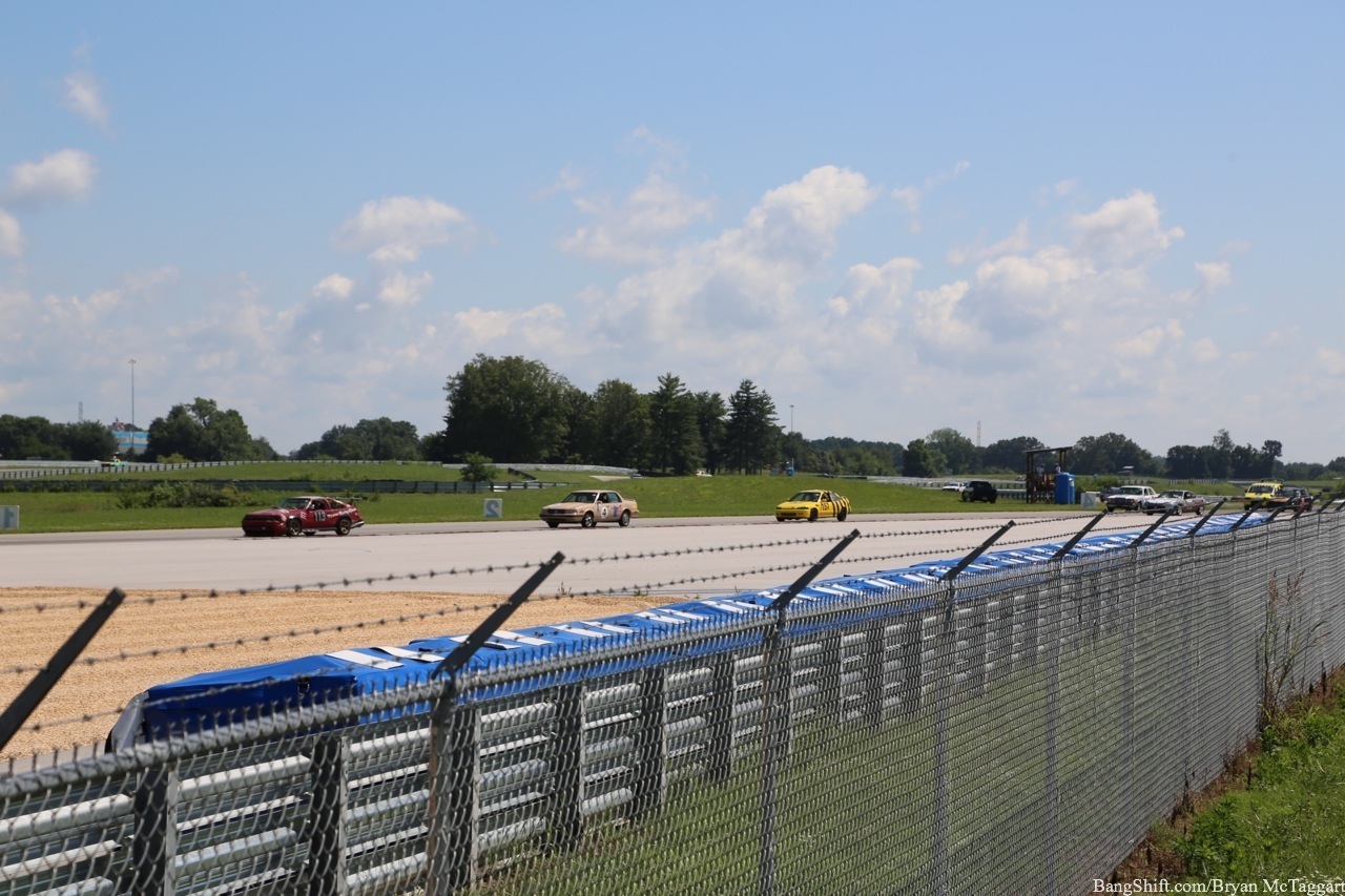Cheap car racing is the best idea of the last twenty years. I’ve got nothing against demolition derbies as a way of thinning out the herd of beaters, but there is a distinct lack of massive barges out there that I’d be willing to use to bash into someone else with, and I’m not trusting a 1984 Cavalier to hold up, I don’t care who built the cage. Events like ChumpCar and the 24 Hours of LeMons, on the other hand, give old Trusty But Rusty one final shot at glory, a chance to be the race car they always had hoped to be…even though they had all the horsepower of a lawn tractor and could get stomped by a borrowed minivan in a stoplight drag. Since LeMons judge Eric Rood was in town to judge the “Kentucky (Demo) Derby” event at NCM Motorsports Park, I figured it was worth the effort to make a quick appearance in the heat and humidity to check out the sights and sounds.