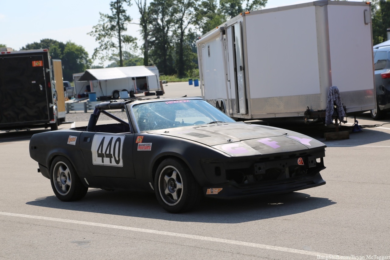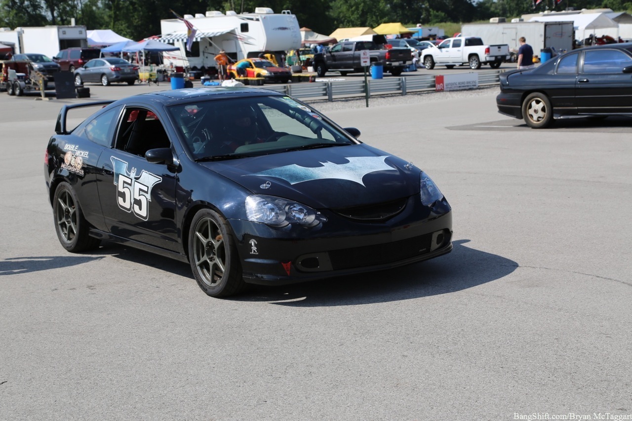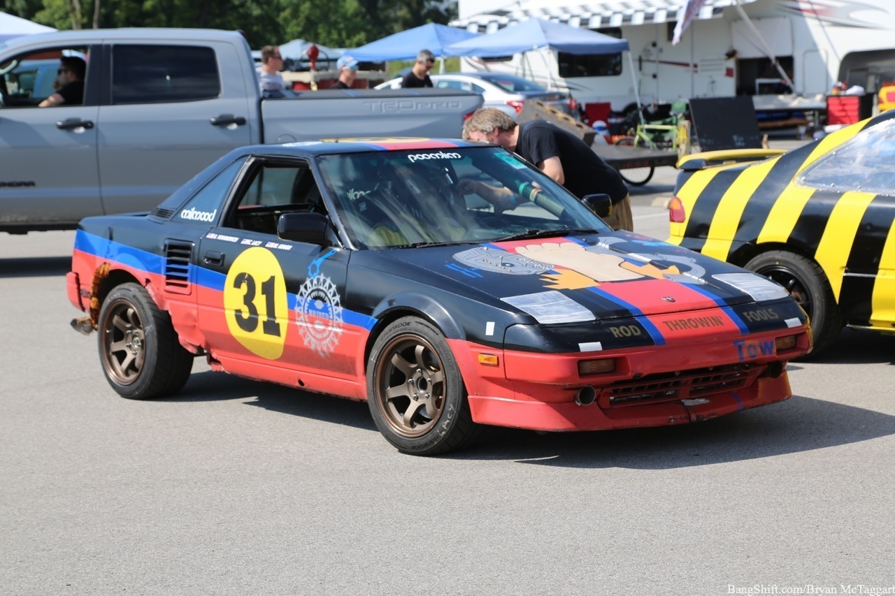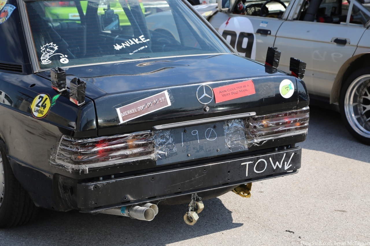 Cheap car racing is the best idea of the last twenty years. I’ve got nothing against demolition derbies as a way of thinning out the herd of beaters, but there is a distinct lack of massive barges out there that I’d be willing to use to bash into someone else with, and I’m not trusting a 1984 Cavalier to hold up, I don’t care who built the cage. Events like ChumpCar and the 24 Hours of LeMons, on the other hand, give old Trusty But Rusty one final shot at glory, a chance to be the race car they always had hoped to be…even though they had all the horsepower of a lawn tractor and could get stomped by a borrowed minivan in a stoplight drag. Since LeMons judge Eric Rood was in town to judge the “Kentucky (Demo) Derby” event at NCM Motorsports Park, I figured it was worth the effort to make a quick appearance in the heat and humidity to check out the sights and sounds.