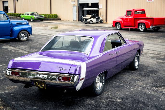 This example is an original Dart Swinger 340 that came from the factory in one Mopar’s crazy, straight-out-of-the-70’s colors; Plum Crazy Purple. Plum Crazy was easily one of the most well-known Mopar colors from back in the day. Plum Crazy wasn’t the only wild color they had. Go Mango, Panther Pink, Top Banana, and Citron Yella are just a few that come to mind.