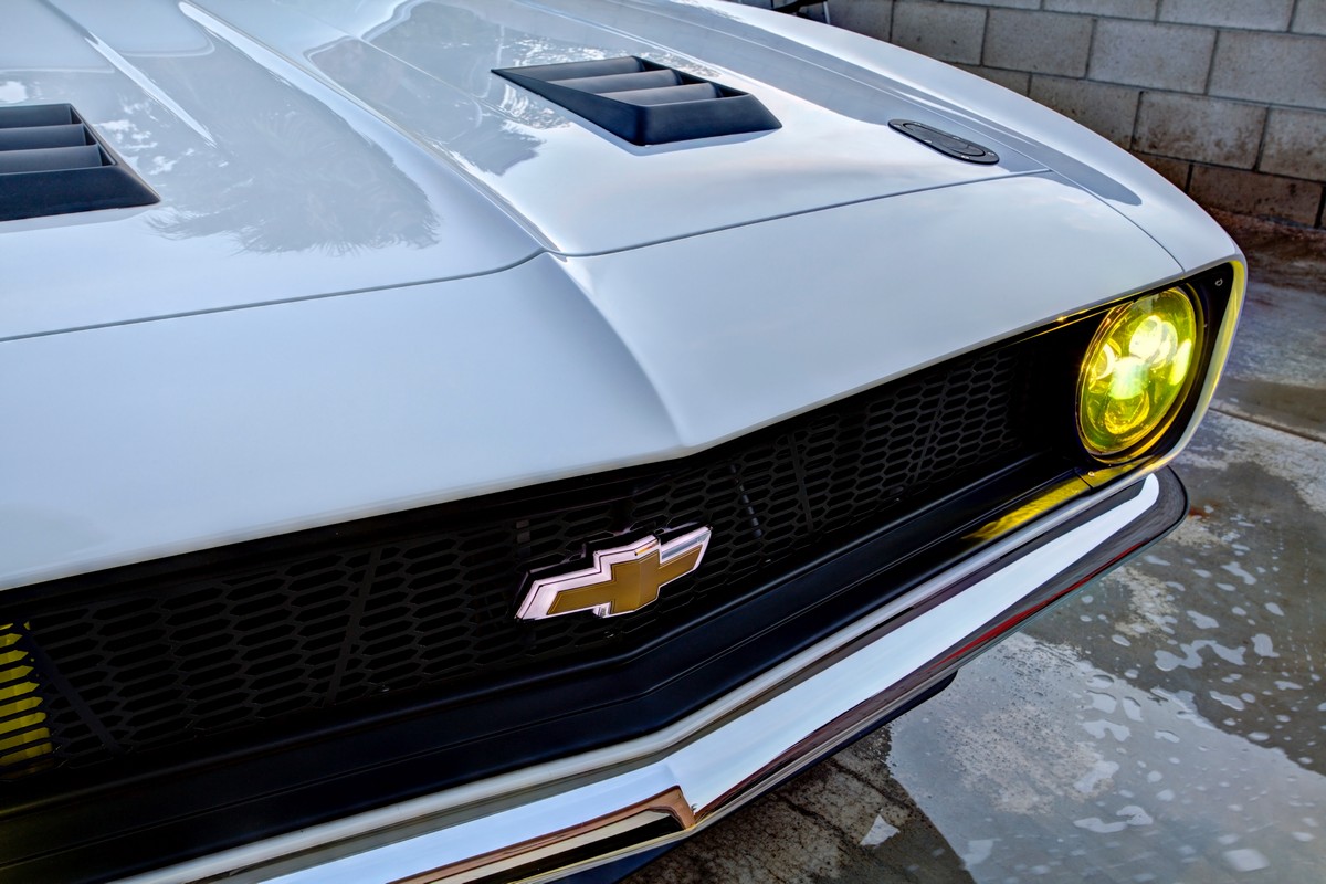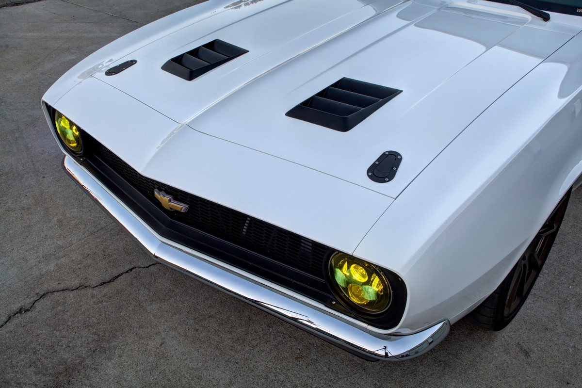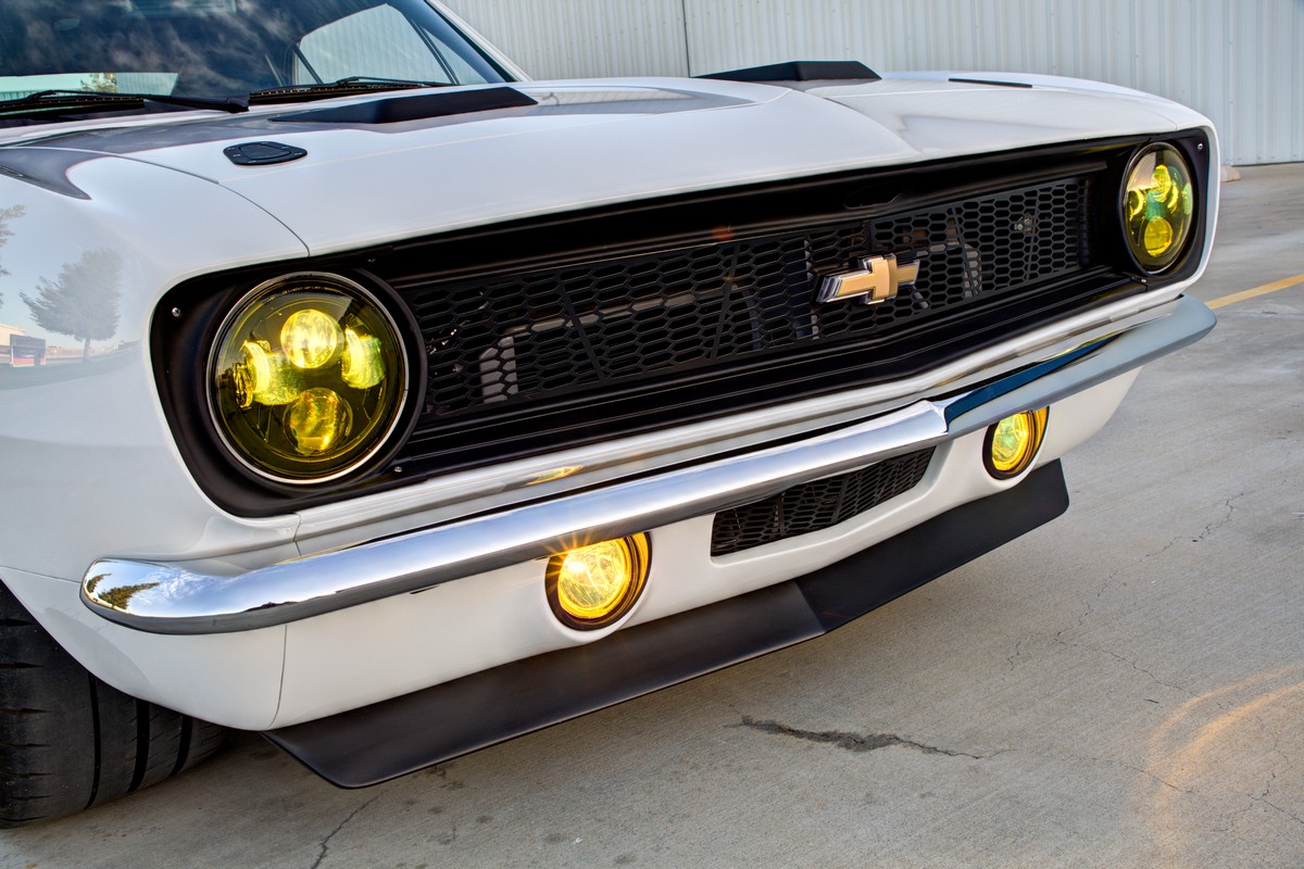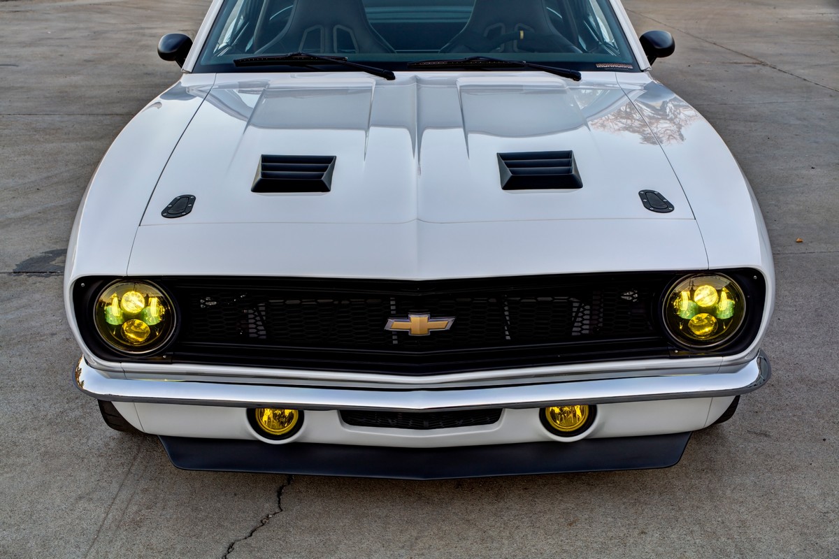 The Camaro’s front grille was custom-made, and the lower front valance was extended, not only for a distinctive appearance but also to accommodate a larger diameter fog light. The body was sprayed in Henrich’s favorite PPG Summit white paint, ensuring the car’s appearance was as stunning as its performance.