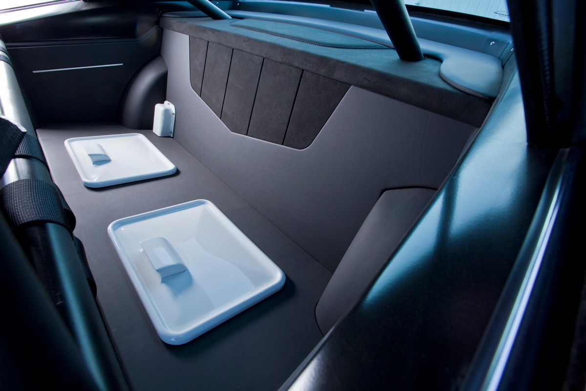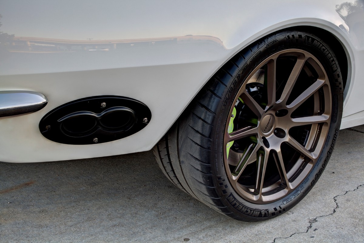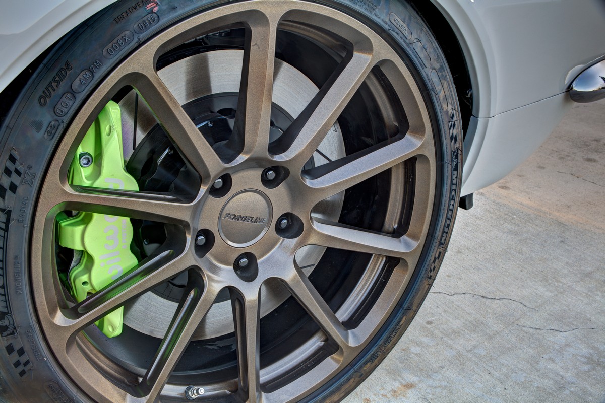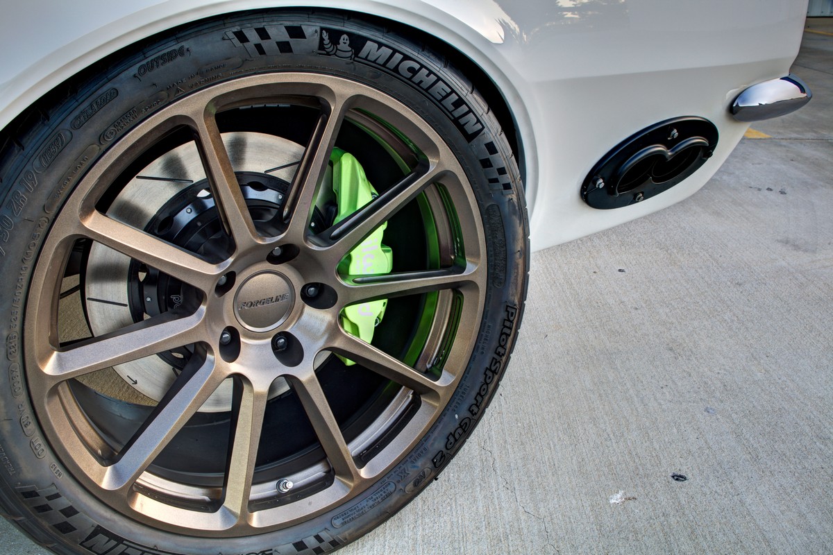 Behind the Forgeline wheels are a set of Wilwood 14″ brakes with highlighter yellow calipers, reminiscent of Porsche Carrera design cues. These brakes compliment the wheels and suspension package.