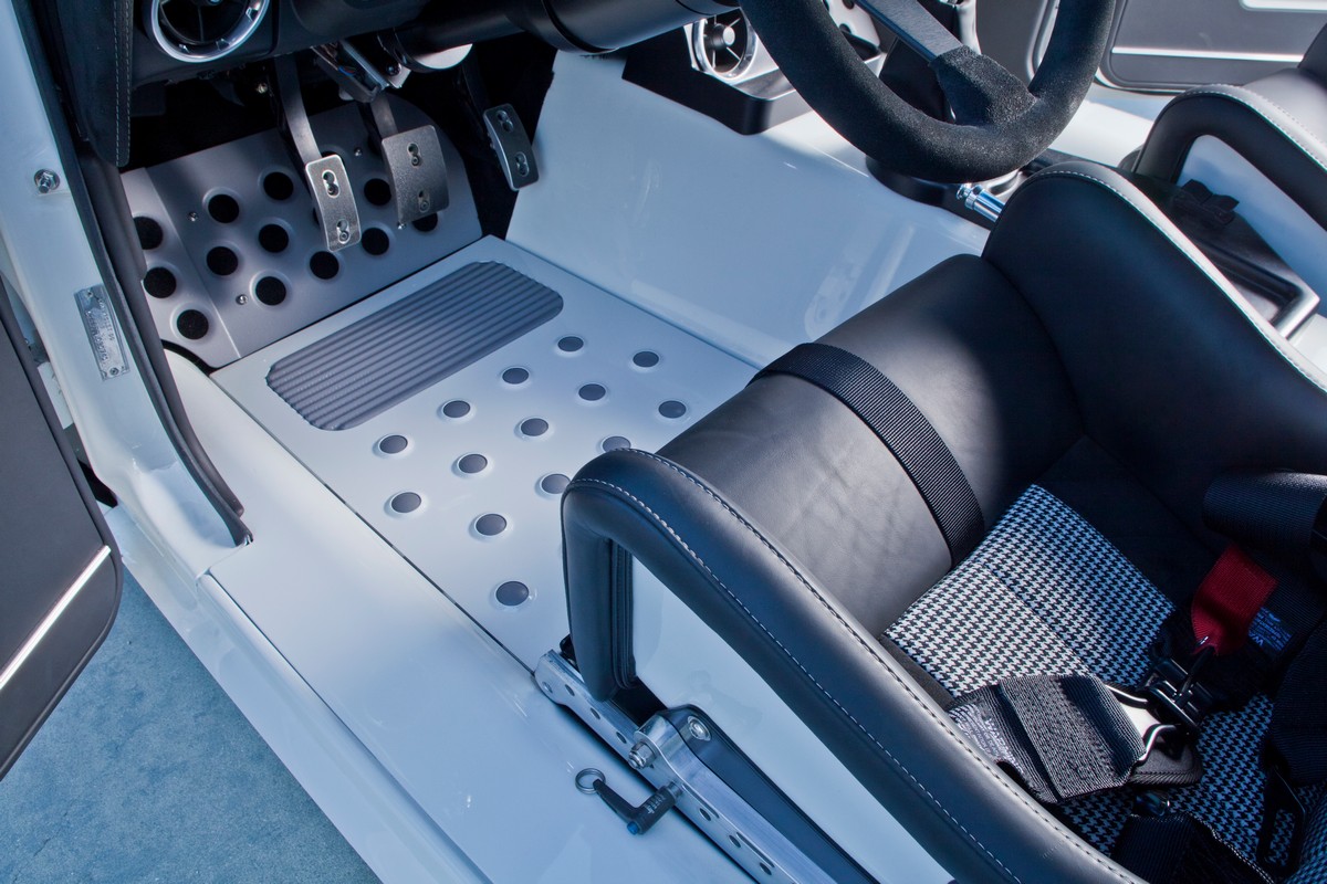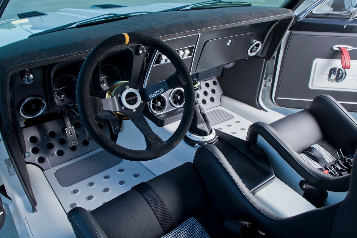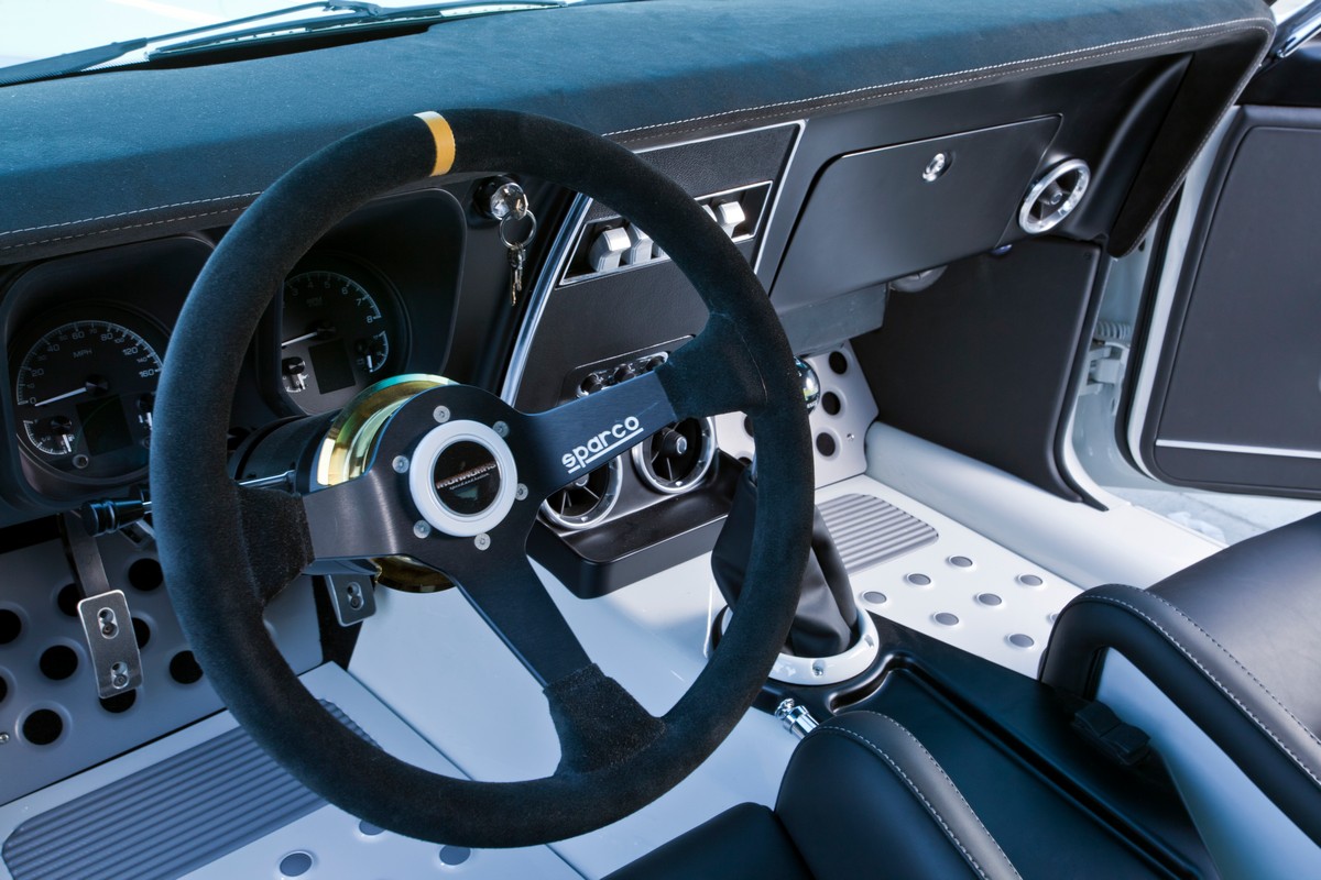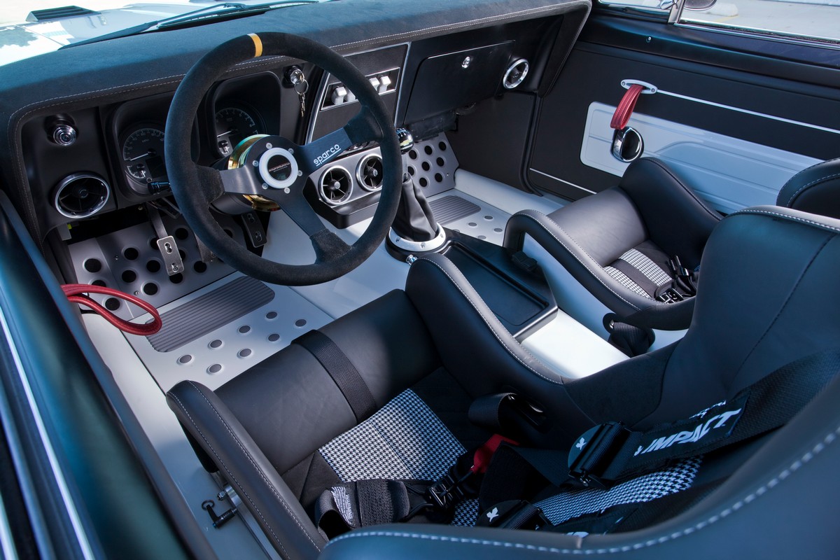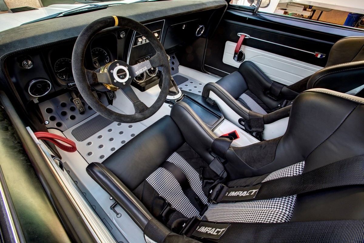The Camaro’s interior received special attention with carbon fiber Sparco seats, painted and recovered by Sid Chavers, showcasing a distinctive Houndstooth interior design. The interior is right at home on the car show circuit, but it’s all business. The seats are designed to hold you in place during cornering.Â