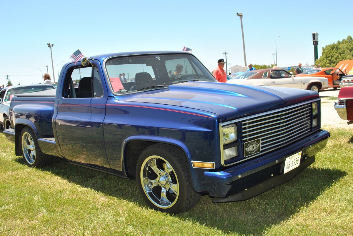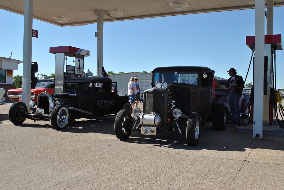 Day 3 had us heading north out of Grand Island, NE taking the long, long way to St. Paul. Our morning stop was hosting by the Royal Coachmen Car Club whose headquarters are right in downtown St. Paul. These gals and gals have probably the coolest car club house on the planet. It is an 1930’s era service station that is literally across the street from the county courthouse. This is very convenient if any club member needs to go to traffic court. The gas station part had an extension built on it some time ago which is now being used for the club meeting rooms. The station’s store front looks like someone closed the door in the 1950’s and walked away. Stepping into the station is literally like stepping back in time. The club members also have a three stall shop building out back. I don’t see club members’ spouses seeing them much. The Coachmen did a great job of directing traffic, parking the participants, getting 400 vehicles in and out of town without causing chaos.