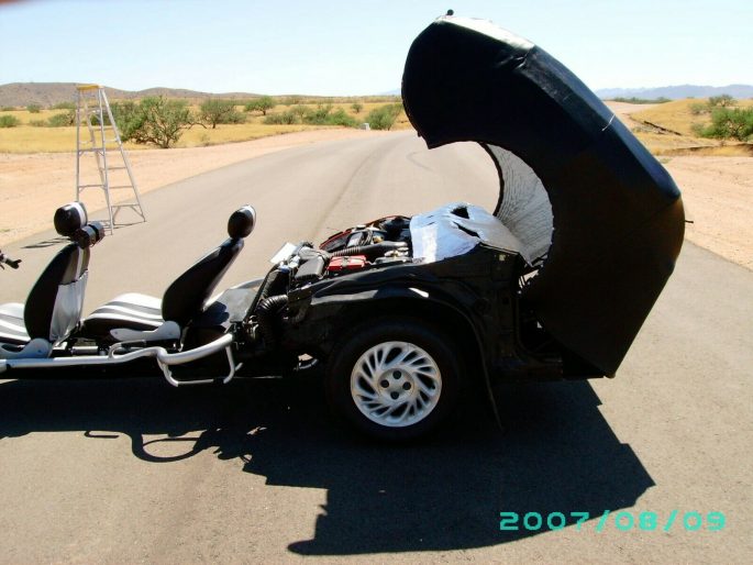 This does look like it could be a fun thing to throw together out of a motorcycle with a seized engine and a wrecked Saturn. But he’s attached a serious-money price to a horsing around with scrap project. To be fair, it looks like serious-money fabrication too, but who else is going to pay for it? Maybe he’d first built one out of scrap and liked it so much he wanted to see what it would be like with a higher end fit and finish?