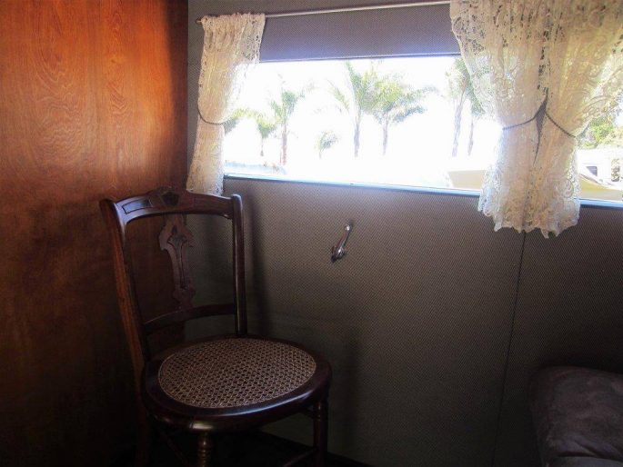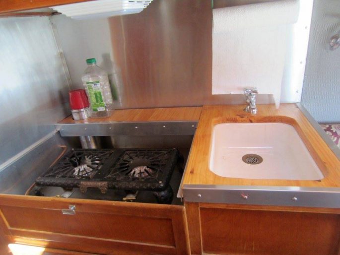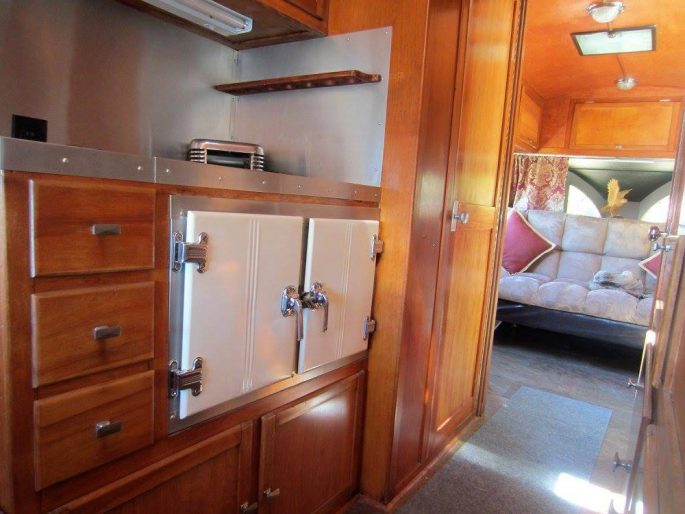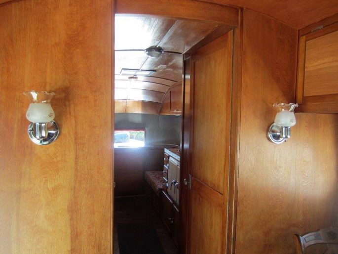 1930’s Curtiss Aerocar Land Yacht, beautifully restored to its former glory. Everything looks and works just the way it was designed 70 years ago. This gorgeous 22 feet long Aerocar sleeps 4, has a bathroom (toilet and sink), full kitchen (2 burner stove, kitchen sink, ice chest, storage cabinets), the beautiful interior has been restored to its unique historical beauty. The whole trailer has been restored and it looks beautiful, a real head-turner and a true historical vehicle.