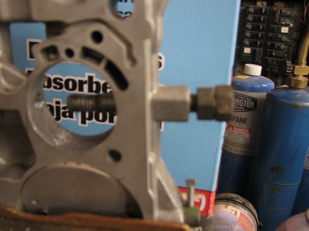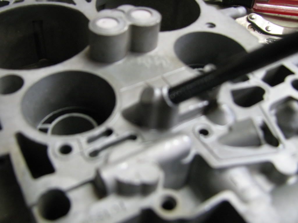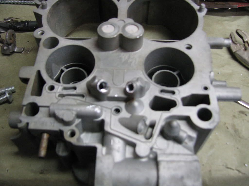 Idle mix bores. Drilled them to .106 These were of the sealed variety and I had lots of fun getting them out. If you dont do the down tube modification these will have almost no effect. With the down tubes sized right they work just like normal mix screws on a gas carb. The bigger holes make sure you can get enough fuel to let the engine idle correctly.
