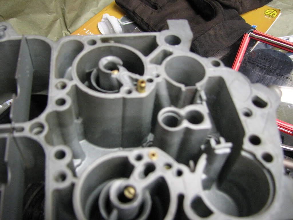 Idle down tubes. Pull em out and drill the ends to .046. Pulling them out is described in Cliffs book, and he provides new ones in his kits. Simply you use a .090 punch to drive the inner tube down inside the collar, then you use a sheetmetal screw to grab them and yank them out with some dykes and a screwdriver as a fulcrum. This can be a huge pain in the ass, and one on the first carb gave me fits, but its out now.