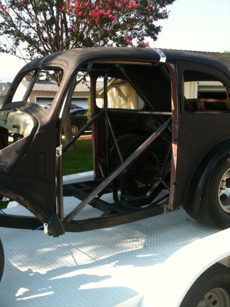So, over the last couple of weeks I managed to get my first real work done on it. I ordered a 10 point cage from Jegs, and tacked it into place. Now, I'm trying to learn how to weld, and I think this is a great project to learn on. BUT, the roll cage is not the place to learn (I make pretty good booger welds at this point). So, I custom fit all the cage pieces and lightly tacked it into place and I'll have a real welder finish it up for me. I have a couple of chassis guys in mind. So, this is where we are with it right now, it'll be a slow moving project, but I'll update once in a while. I know there are some gasser guys on here that will dig it!