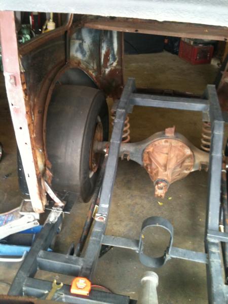 Anyway, about the car. I acquired it 4 or 5 years ago from a buddy of mine. He had it sitting out at his place in the high desert for a while with some plans to build it. Well, that changed when he managed to score a complete vintage 60's Anglia panel (Thames) gasser out of someones garage in, I think, the Victorville area. It's extremely cool and I'm very jealous. So this Anglia sedan became available. I've always wanted one so I asked what he would take for it. He replied "Trade me a guitar for it". Since I have 20+ guitars in my collection, I said "DONE!" I traded a nice 1994 USA Fender Strat in a tweed case for the car. So, I've put away a few parts for it here and there and I've finally managed to actually get started on it. As you can see in the photos, it's just a shell on a chassis that had alredy been back halfed with a ladder bar setup with a narrowed Old/Pontiac rear end. I'm planning to keep that but add coilovers in the back. The front has an Opel front end grafted on. The jury is out on whether I'm going to keep that. I like it, but the tires stick out of the fenders. No good. If I can figure out a way to make it narrower, I'll do that. I have a complete fiberglass tilt front for it, it had fiberglass doors but I traded those for some stock steel doors.