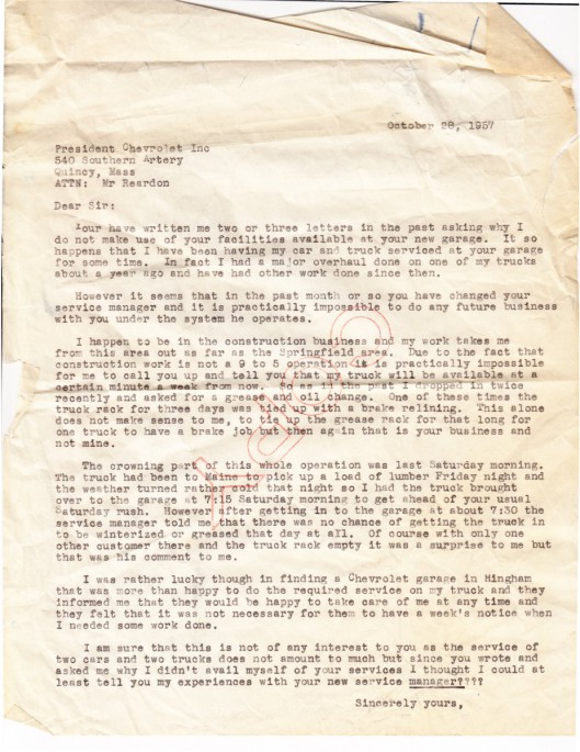 During the 1950s and early 1960s my grandfather owned a construction company that did all different kinds of projects. As part of his operation he had a few trucks, one of which was a Chevy. The letter below is about that truck. More specifically it is about how shoddy the dealership service department has been in taking care of said truck. This letter cracks me up because he takes the dealership up one side and right down the other without ever getting nasty or profane about it.