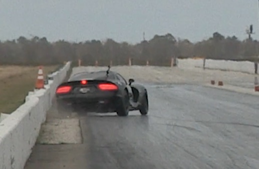 This particular late-model example was participating at the Viper Nationals in Houston, Texas. Not once, but twice, does the psychotic coupe hang it’s tail out down the track. While there are suggestions that the differential was playing games, we suspect that a hard third-gear shift might have helped somewhat. But you can see the photo for yourself: that isĀ damn close to that wall. There might be concrete traces on the quarter panel just from the dust that got kicked up as the driver corrected. We imagine that it’s going to take a lot of leather conditioner to get the bite mark out of that seat.