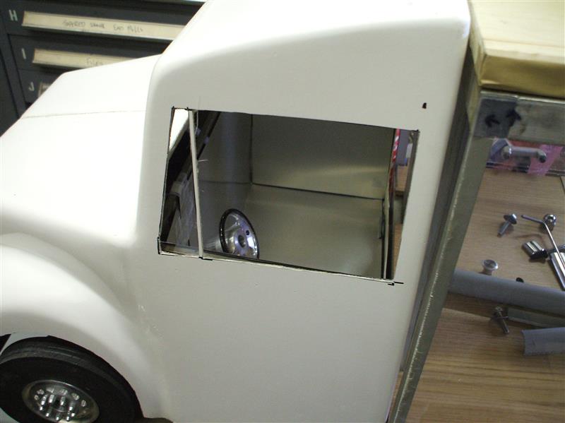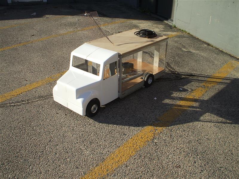 Firstly, let’s talk about the cab. Mike was not happy with the way cab version 1.0 came out so he decided to kick it up a notch and make a buck himself that could be then handed to an ace body man that could lay up fiberglass and produce the piece. Casella went to a local flower shop, bought a case of that green foam they use to jam flowers into and glued it all together. He then hand carved an exact replica of the full sized motorhome cab. Just that easy…year right! After he was satisfied with the carving job, he shipped the foam to his pals at Manheim Body and Fabrication, a bitchin’ body shop in Manheim, Pennsylvania. (Give ’em a call if you are in the area and need work done! 717-665-6061). Those guys actually molded the cab out of ‘glass and shipped it back up to Mike. He then cut out the windows and added stuff like mirrors and other details. You’ll see all this stuff below, but we wanted to fill in some gaps. (Apologies as some of the photos are out of order, I am trying to get a handle on some new blog tools we have….the bad assery of this whole thing overrides the sequential order…trust me).