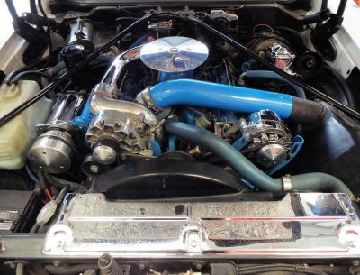 Engine: Olds 350- bore .030, custom Jans supercharged pistons, crank .010 / .010 nitrited, Mellings high volume oil pump, True roller timing chain & gear set with index, TRW/Clevite bearings, Joe Mondello cam 115 lobe center – very smooth idle, good vacuum/lifters/push rods/valve springs/keepers retainers, SS valves, hardened seats, new guides, new rocker assembly, port & polish gasket matched, fluid dampener, balanced assembly to within 1/4 gram, heavy flexplate balanced with motor, custom Martch aluminum pulley set, V belt stock; poly-ribbed for supercharger, custom undersized supercharger pulley (boost comes on @ lower RPM off idle), custom hydraulic motor mounts, brass freeze plugs, aluminum intake manifold.