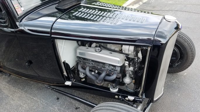 The body was place on a heavily modified 1932 Ford chassis featuring full torsion bar suspension on the front and rear. This offers adjustability and an improved ride while retaining traditional styling. The front of the chassis has been bobbed and pinched. It features an ultra-rare Ford V8/60 axle, 1940 ford brakes and 1934 Ford shocks.
