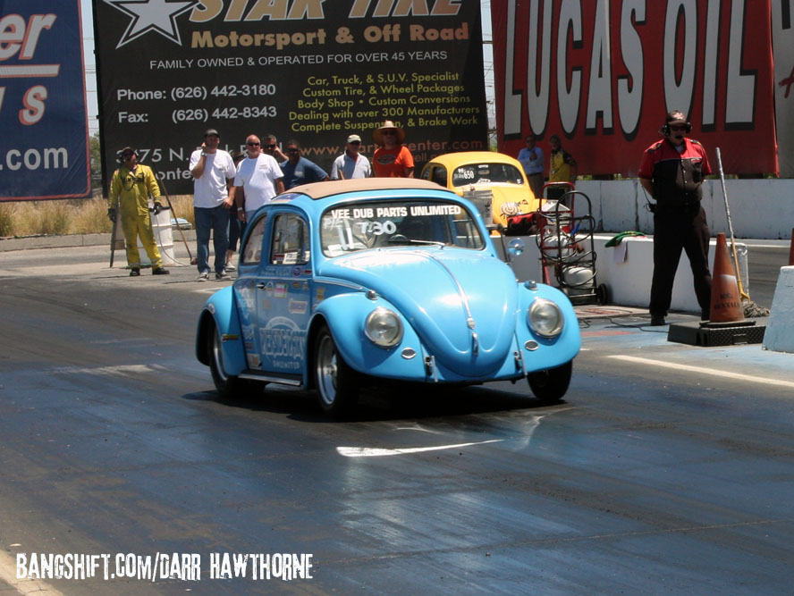 HOT VWs Drag day has a lot to offer for every kind of air-cooled VW Enthusiast with a small swap meet, car show & shine and hot VWs packed into the staging lanes waiting for action on the Irwindale 1/8 mile Dragstrip, attracting nearly 200 racers.