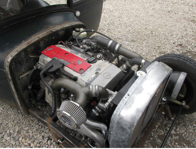 Hey, since we were loving all over a 1935 Chevy, why can’t we continue the fun with a 1928 two door sedan now? This car caught our eye on ebay because of its low slung look and also because it is running an engine package that we’ve never seen in a hot rod before, a little supercharged four cylinder Mercedes engine that would normally be found in a 230 SLK. That engine makes about 200hp and was good enough to shove a significantly heavier car down the quarter mile in the mid-15 second zone so in something like this sedan that is a total flyweight in comparison, it should get down the road really well. The seller reports 30mpg out of the combo over the course of 3,000 miles, so that’s another neat little check mark in its favor. Plus, there is the show trump card where no one will be able to figure out what it sounds like and then when you open the hood, the quizzical looks will really pour in.