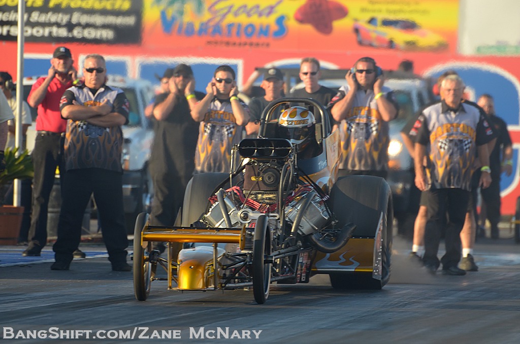 (Photos by Zane McNary) – The most specialized vehicles in the sport of drag racing are the aptly named dragsters. They do not turn well, they do not stop well, they do not provide a comfortable ride, and in the case of Nostalgia Top Fuel, they do not even provide a direct line of sight straight ahead. What they do accel at is going damned quickly from a dead stop to 1320ft in a straight line. Altereds are the dragsters rebellious older brother. Conceptually the same machine, the altered uses a far shorter wheelbase, making it tricky to drive and breathtaking to watch traverse the quarter mile, often in a wandering, sliding, near pinball fashion. There were lots of these cars at the 2012 NHRA CHRR. Gasoline burning sportsman machines, injected small block Jr Fuel cars, blown fuel burning hemi powered diggers in Top Fuel and of course the likes of the Winged Express and the Rat Trap in Fuel Altered! They’re all in these galleries below so hit the links and check them out!