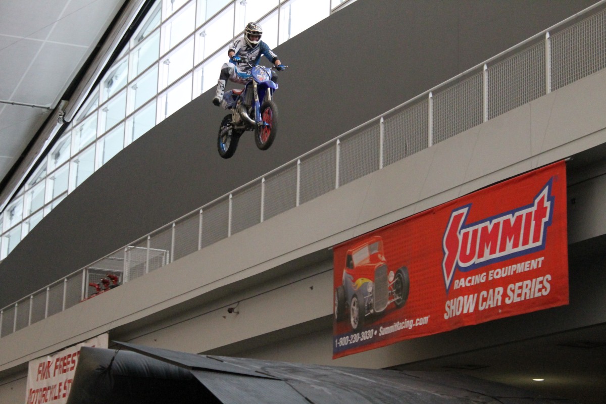 (Photos by Mike Brooks) — Yesterday we brought you the first of two galleries from Mike Brooks who went to the 53rd Pittsburgh World of Wheels show last weekend. While the weather was nightmarish outside, the show looks to have been a smashing success inside the convention center where it was held. Yesterday we saw lots of cool cars and truck. Today is more of that stuff along with flying motorcycles as the organizers had stunt riders performing ramp-to-ramp jumps indoors! These guys are flipping and flying in all directions. Mike stood in there and got some great photos for you to enjoy.