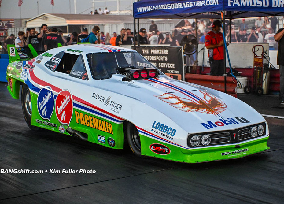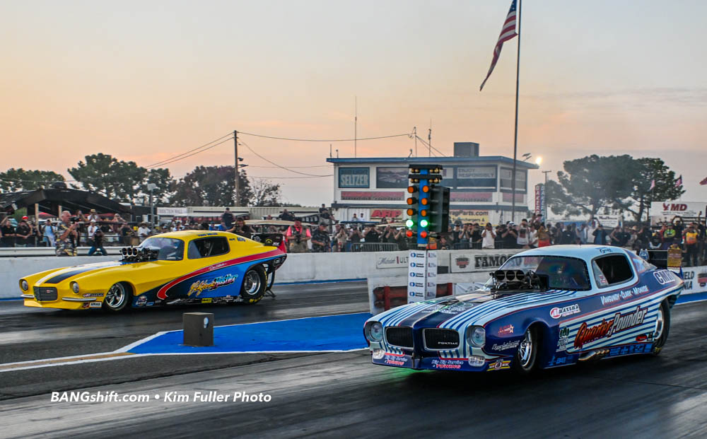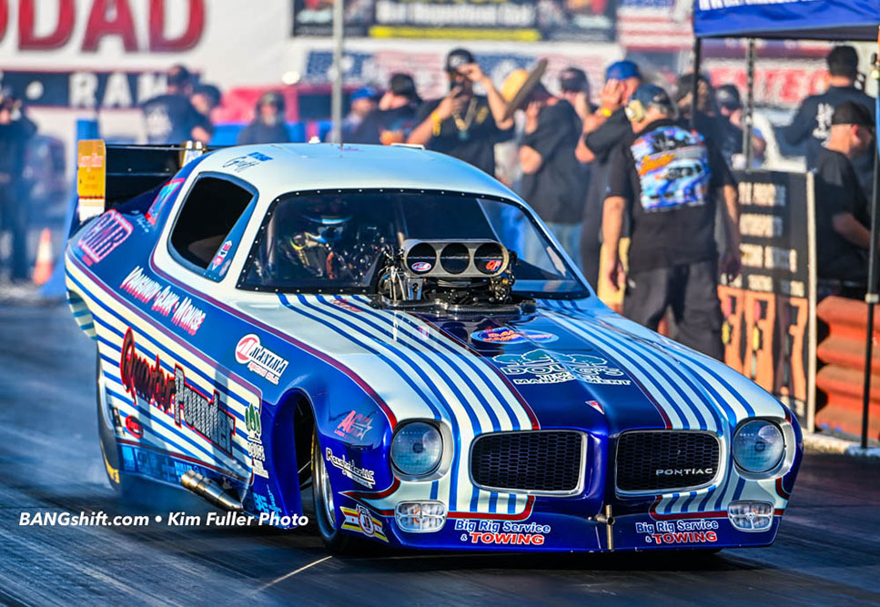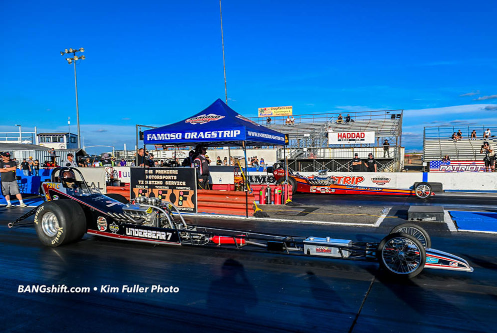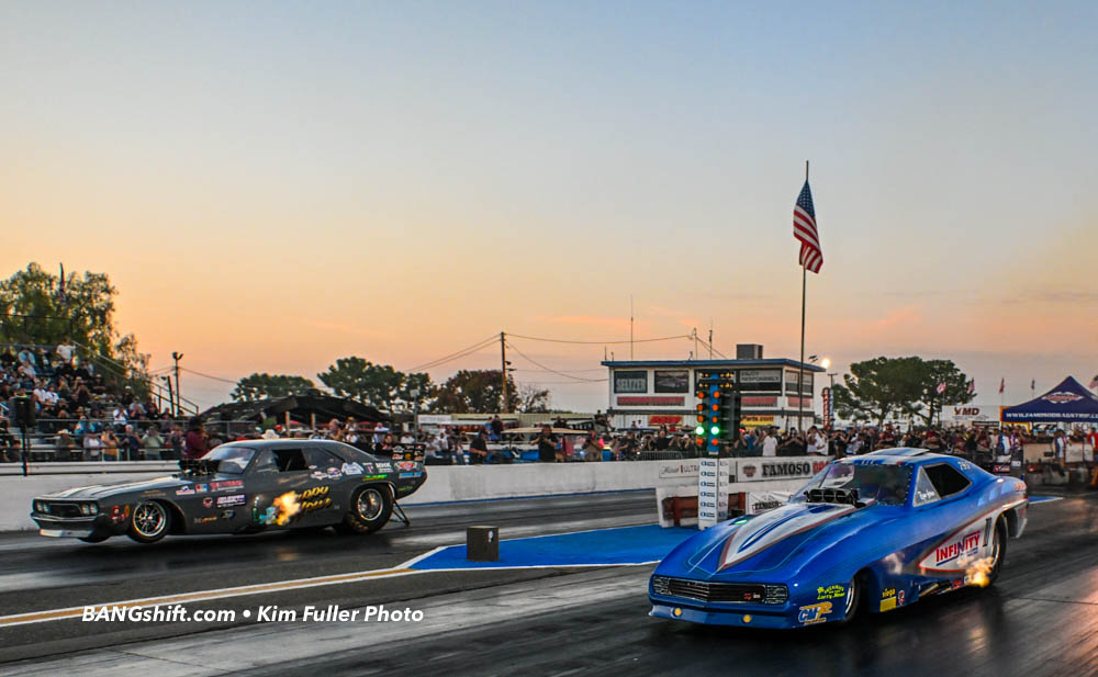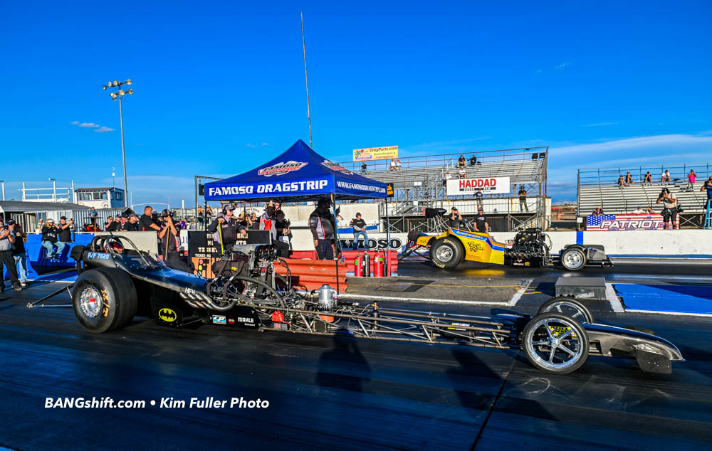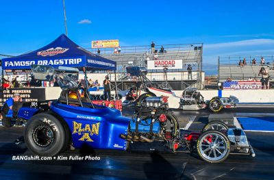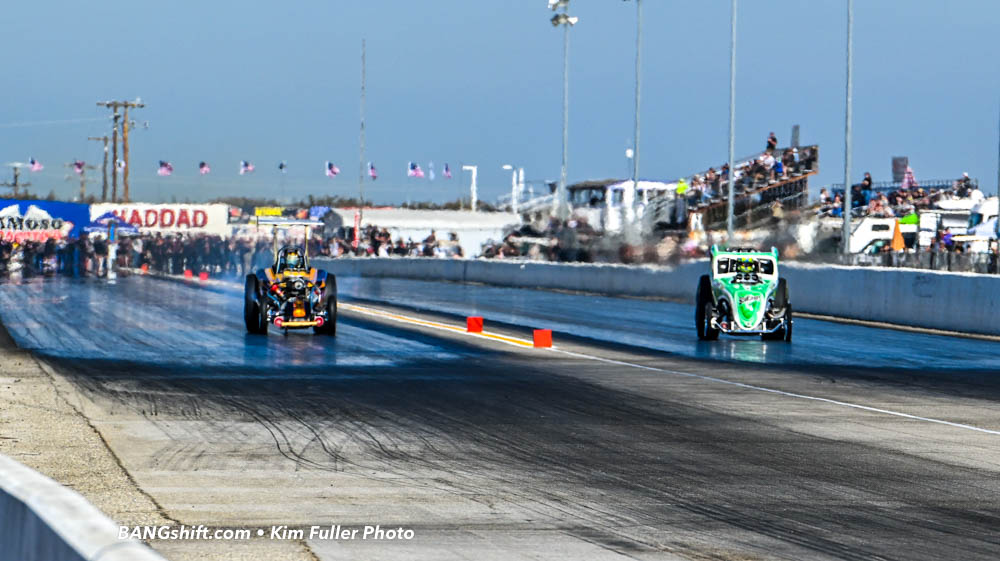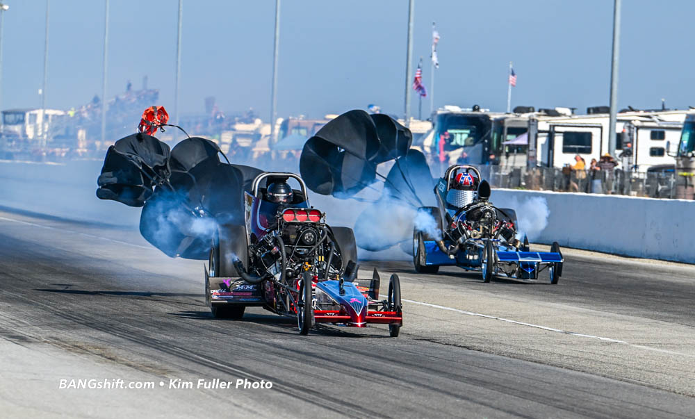 In A/Fuel, Sean Bellemeur, (far lane) from the #2 Qualifying position, driving his ’23 T-Roadster defeated Wayne Ramey’s dragster running a 7.012 ET to Ramay’s 7.117 ET.