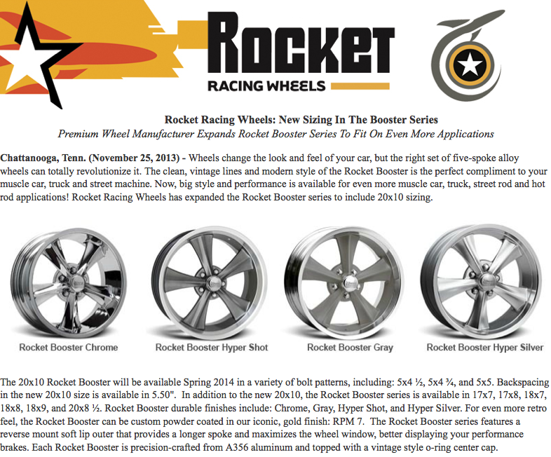 The new 20″x10″ Rocket Booster will be available in all four finishes, including Chrome, Hyper Shot, Gray, and Hyper Silver so you can find one that matches your ride easily. They will start shipping to customers in the spring of 2014, so get your orders in now and have them in time to start hot rodding again.