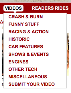 Go right up there to the top of the page, in the red bar below the BangShift.com logo, and you’ll see that we’ve done some moving around of the navigation tabs. There are also some new features to see. Go put your cursor on the Video tab at the far left and you can check out new categories, like Crash & Burn, Funny Stuff, and Historic. Our old video categories are still there, too. This is in response to what we see people using on the site, and it makes it easier to get to your favorite content. Start surfing it.