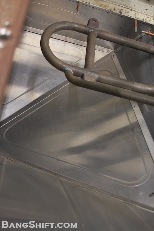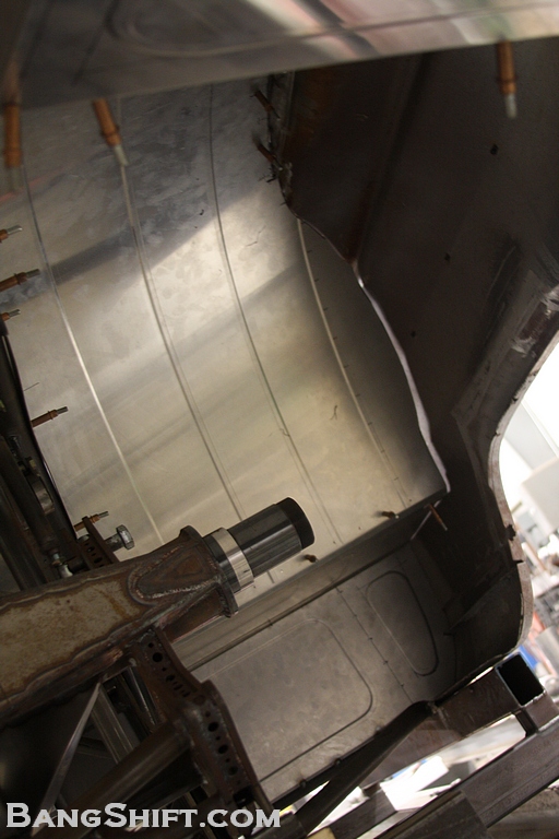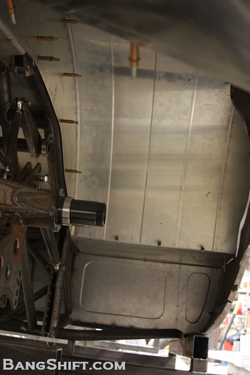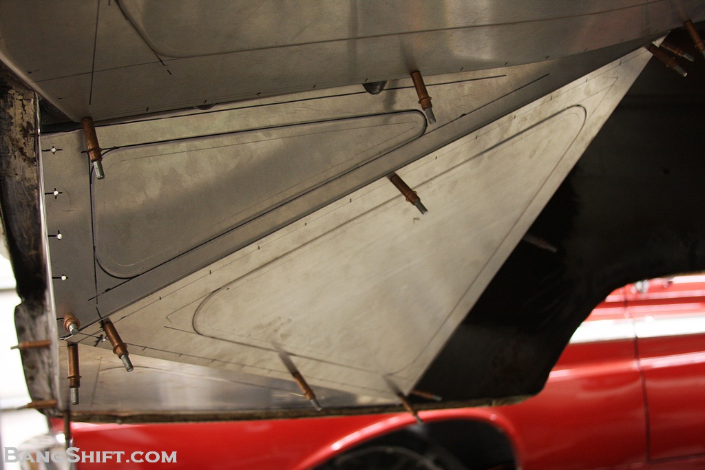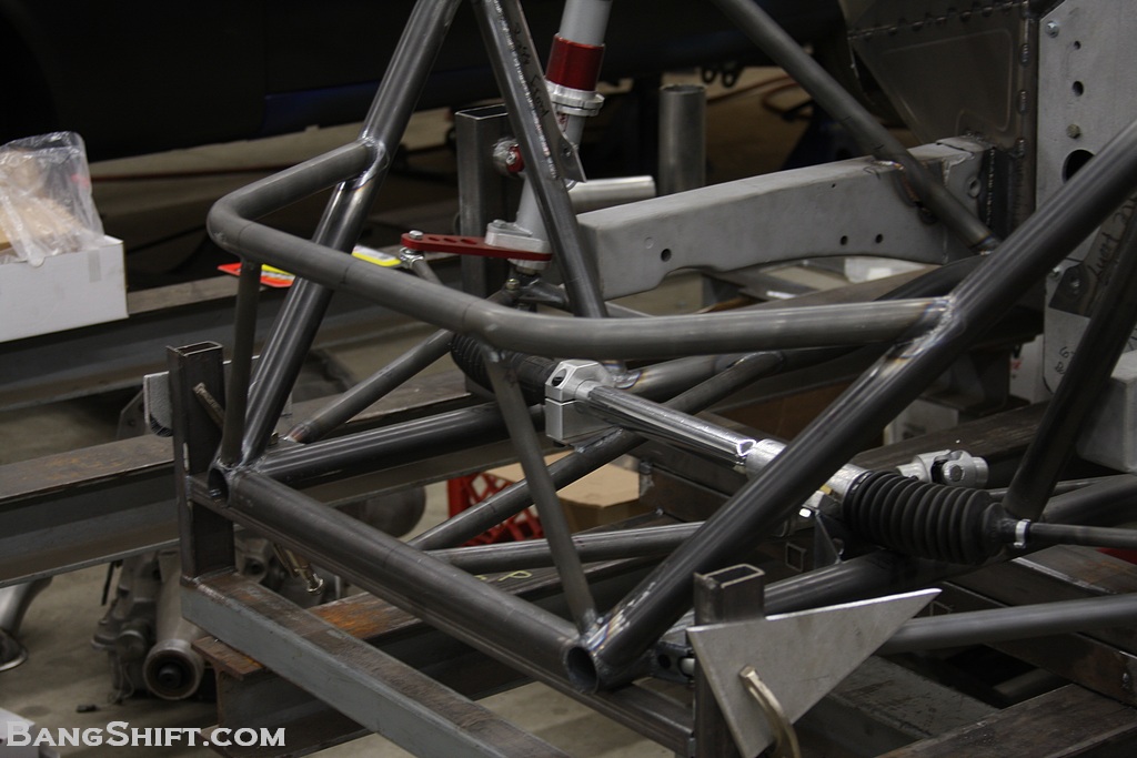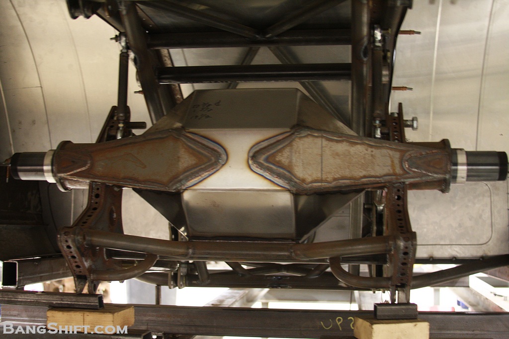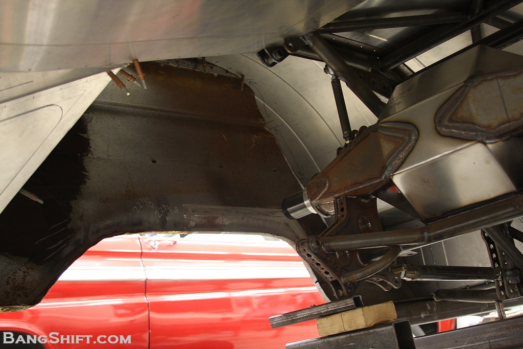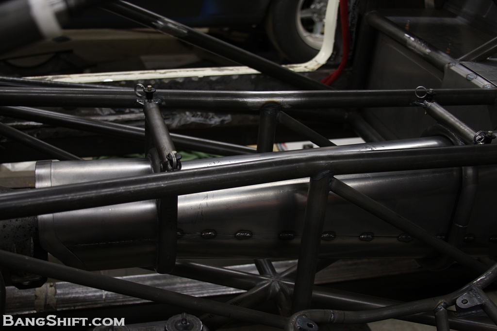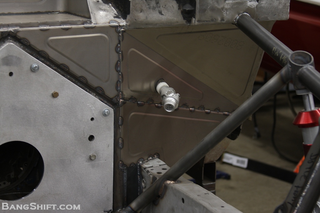 One of the things we hope you’ll get from following our series of stories on the construction of this car is just how much work and how many hours go into actually making a project like this come to life. Outside of all the pipe, and there is seemingly miles of it in there, that has to be fit and cut and welded, there’s stuff like tin work which doesn’t get any of the love that the pipe fabrication does. The tinning of a car like this is a complex and slow moving process, especially if you’re anal professionals like Jon and John at Tube Chassis. From building the wheel tubs that could double as molds for an olympic snow board half pipe, to making the awesome but intricate panels of the floor, this is work that takes time and experience to properly execute. On top of that the welding is nearly artistic. The boys also fabbed up the area in the nose where the fuel cell will live and be protected.