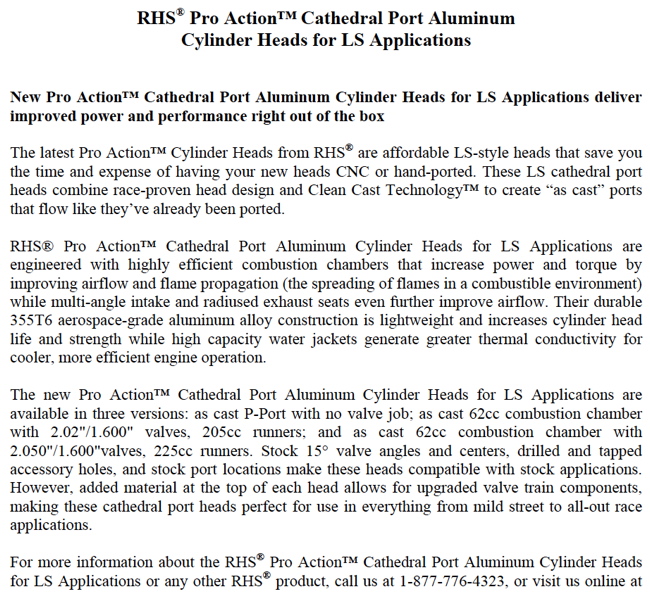 The new RHS Pro Action Cathedral Port Heads for LS are available in both 202 and 225 cc intake runner volumes with added material in all the right places. They feature Clean Cast Technology which RHS says make a cylinder head that flows as well out of the box as most ported combos. For more information check out the dirt from RHS below or visit www.racingheadservice.com.