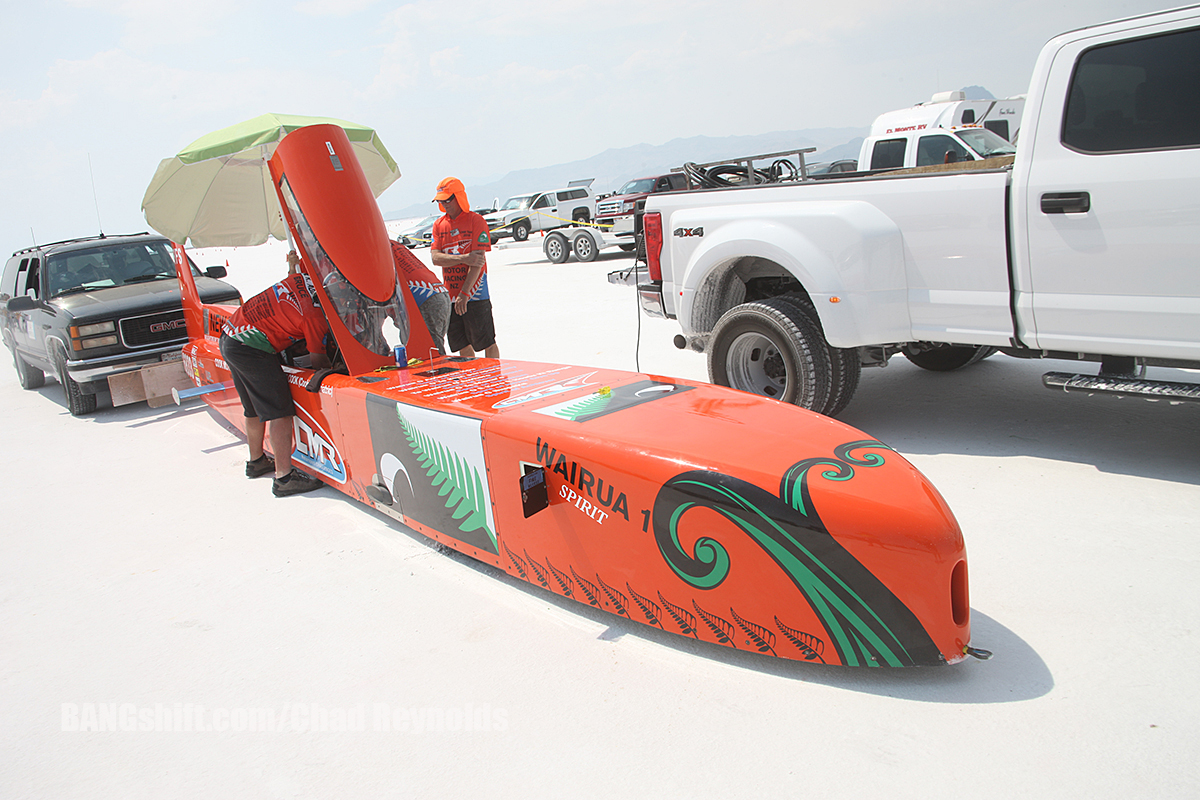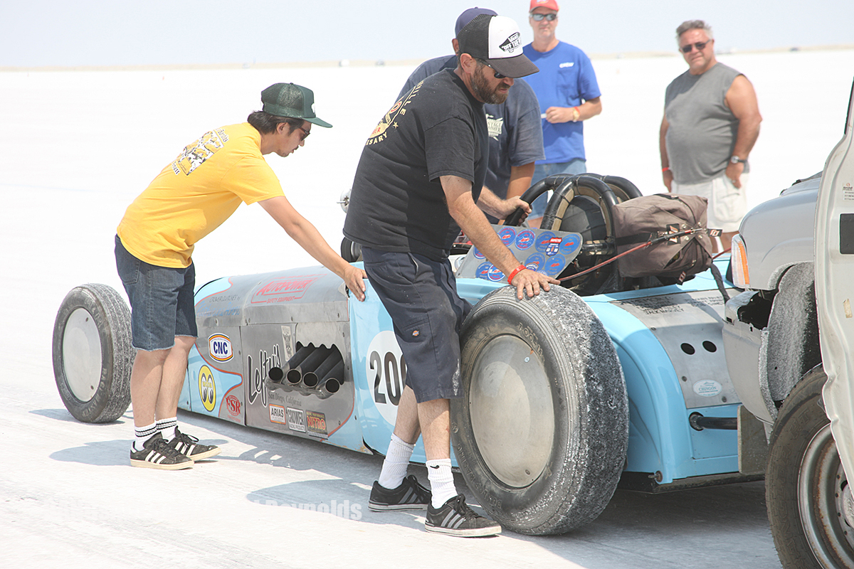 (Photos by Chad Reynolds) – As the week wears on during SCTA Bonneville Speed Week 2018, some really interesting stories are developing. Yesterday the Flashpoint streamliner made its best run ever, achieving a speed of 415mph before kicking the blower belt off its hemi engine. The Speed Demon has a fixed up “A” engine installed and will be lining up this morning to run as hard and fast as it’ll go with the aim being achieving a speed of more than 470mph to take home the Hot Rod Magazine Top Time trophy honors. Amazingly, a new streamliner showed up on the salt yesterday and will be making shakedown runs today. This has been the most insane Speed Week in recent memory with nearly a half dozen vehicles running 400+ mph and scads more running well over 300.